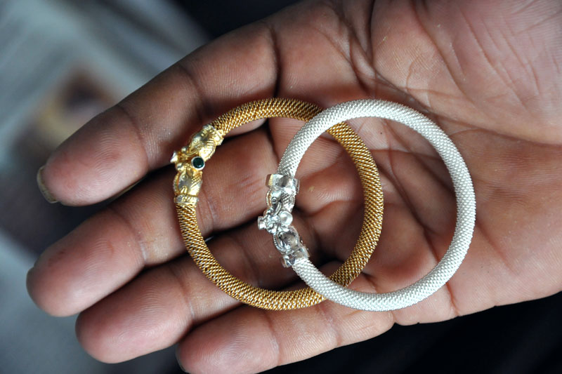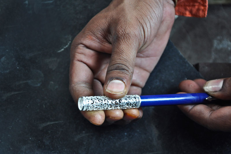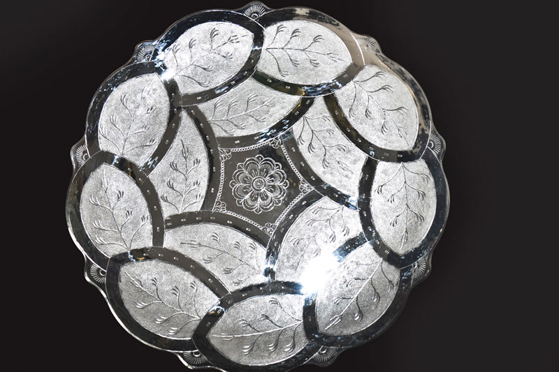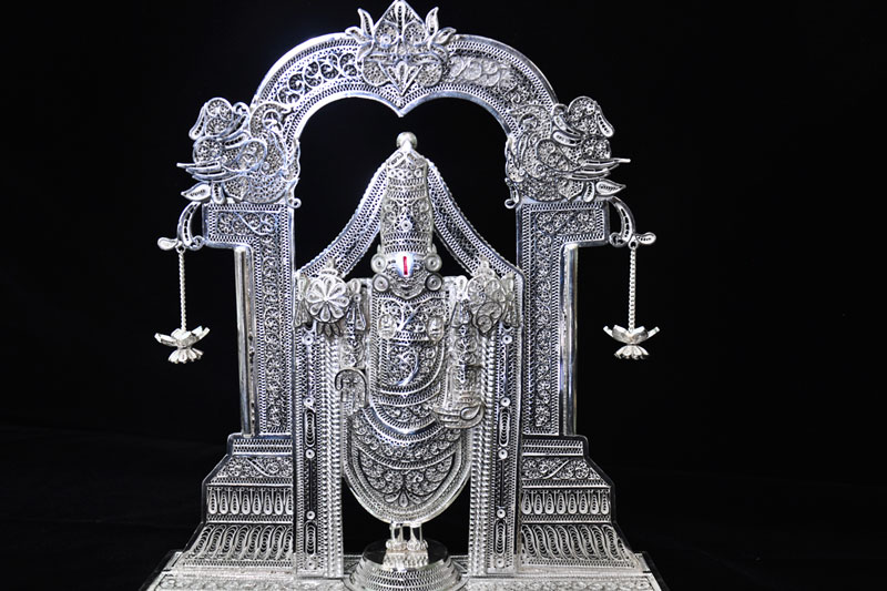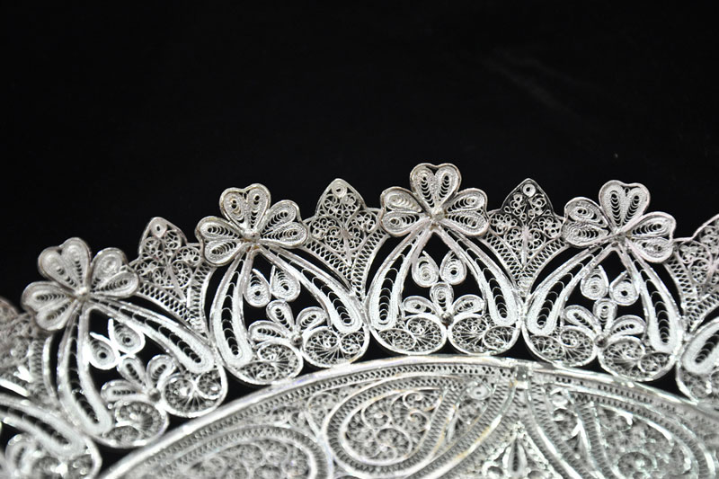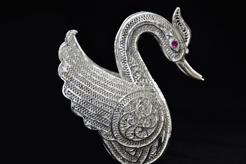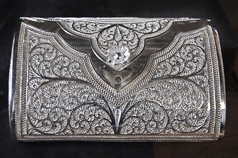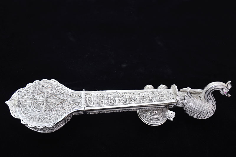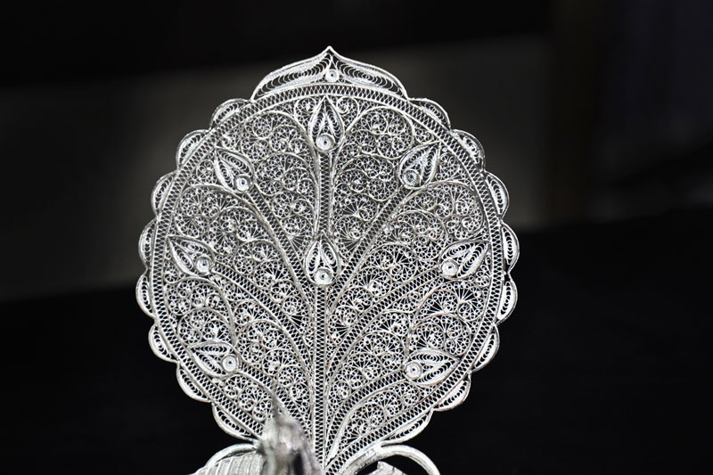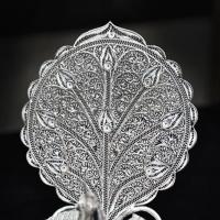Silver Filigree of Karimnagar is a unique art form by expertise craftsmanship. The silver is designed to create range of products with intricate and magnificent motif patterns. Earrings, necklaces, bangles, rings and pendants are included in traditional products. Idols of lord Ganesha, lord venkateshwara adorning figurines of deities created for worship. Puja items and decorative art pieces are created inspired by flora and fauna, Birds, peacock, chariots and even ladies bags utility ware like plates, trays, attardaans, ugaldaans, ittardaans, changerdaans (oodhdan), spoons, ashtrays, photo frames, boxes and cases in different shapes and sizes. Storage items are made with multipurpose compartments for or keeping different items like spices, betel nuts, betel leaf (paandaan). Containers, lamp stands, flower baskets, rose water sprinklers and other fancy items are include in the distinct products.
