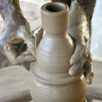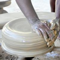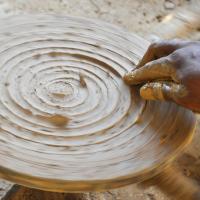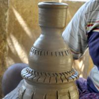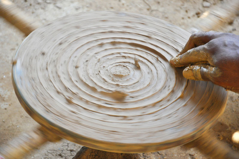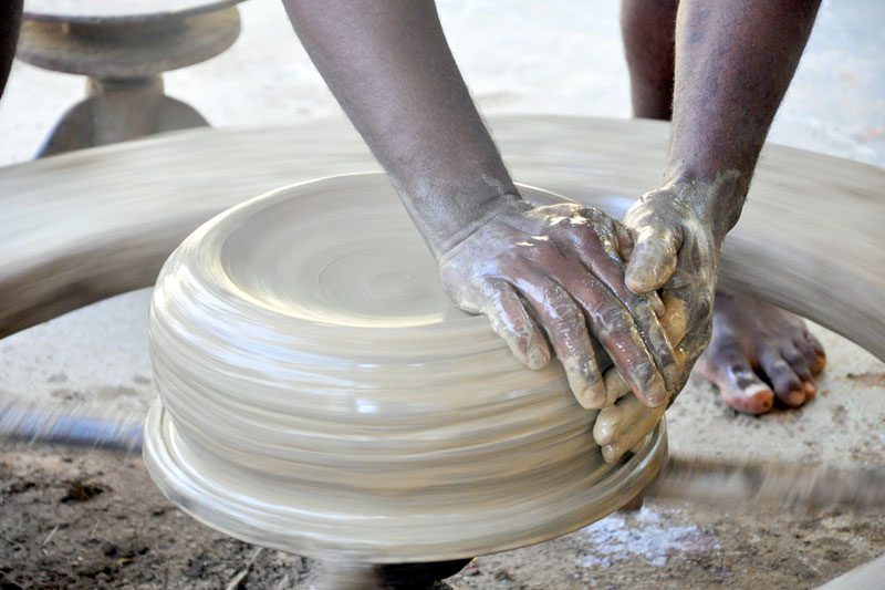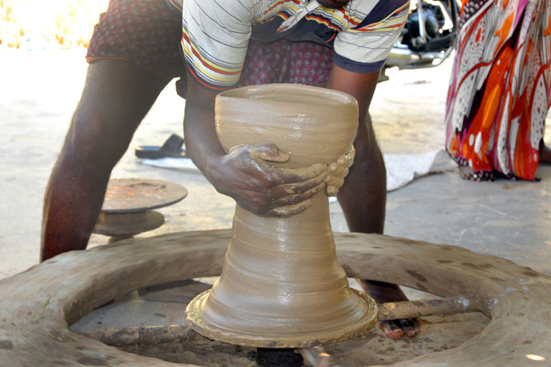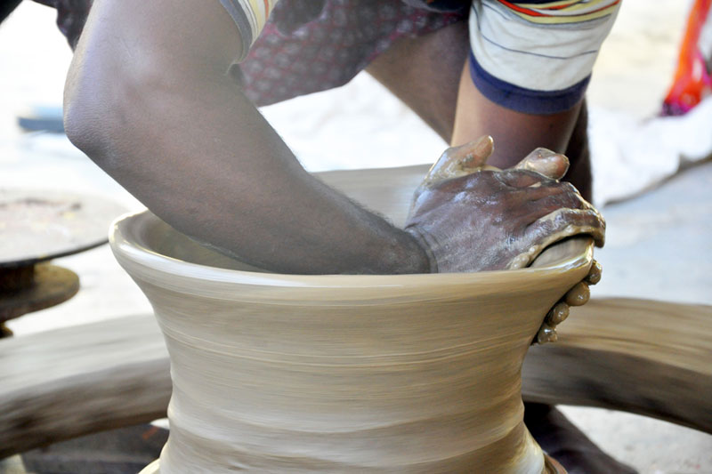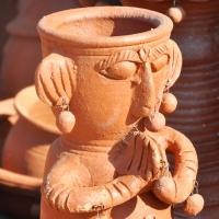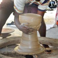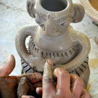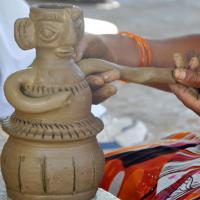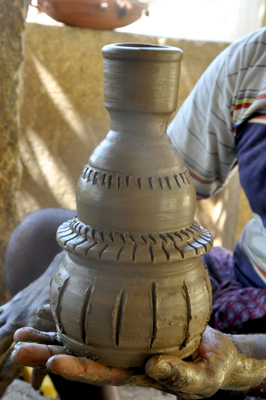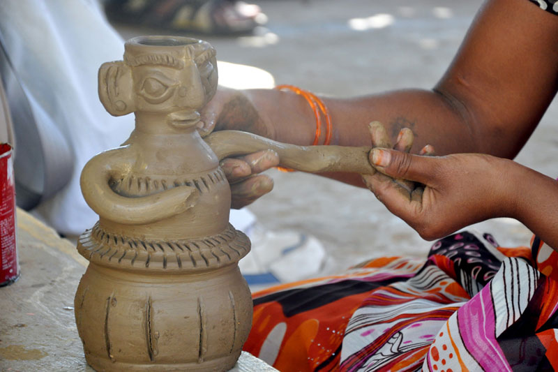 Sadum is a small village located 65km away from Tirupati in Chitoor district in Andhra Pradesh. The ancient earthenware is traditionally practiced by craftsman in Sadum maintaining their own distinctive identity in the products. The practice of terracotta craft has been happening for many generations. The rich clay found in local ponds is very suitable for making clay idols. The finely processed clay is thrown on potter’s wheel and then the different parts of the idol are made independently and joined. Finally it is decorated with clay balls and thin clay coils. The craftsmen belong to Kummari community. In Sadum, the men are normally engaged in making the clay objects on potter’s wheel, wherein the women folk perform the decoration part. The artisans trained by the government training institutes try to introduce the contemporary designs in the products.