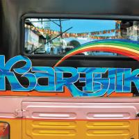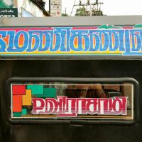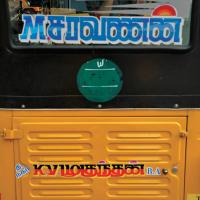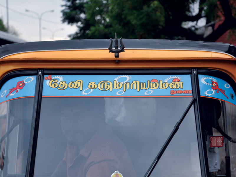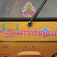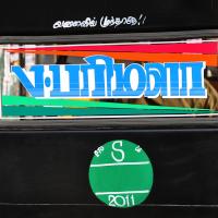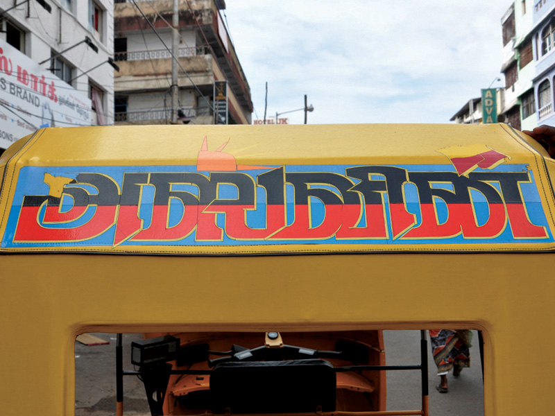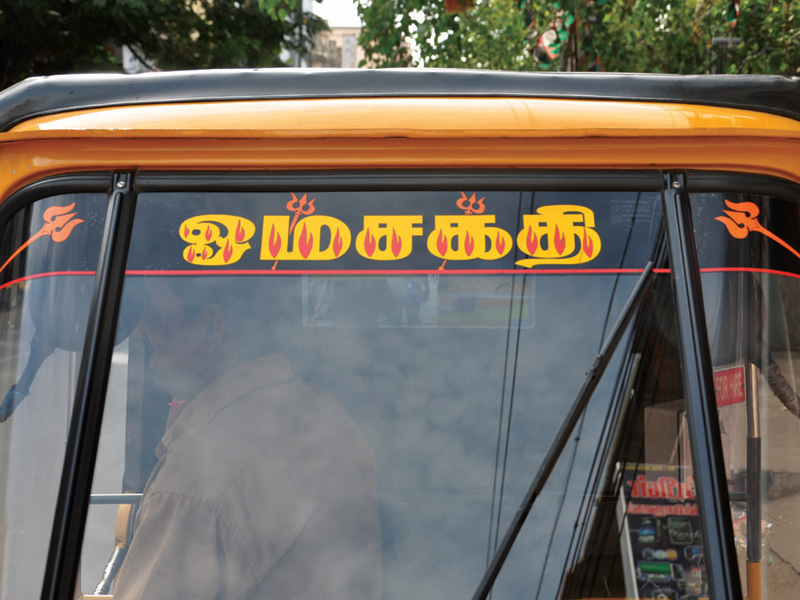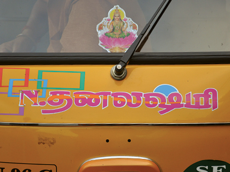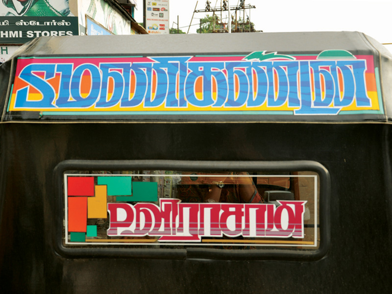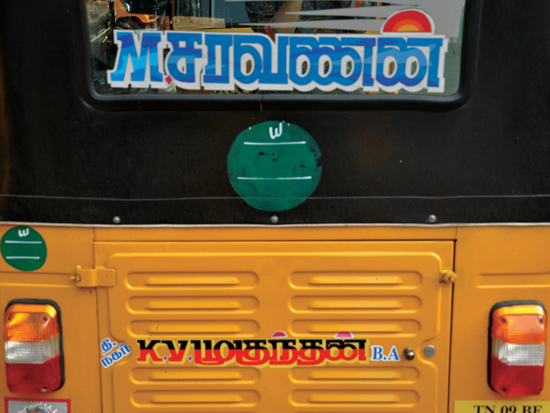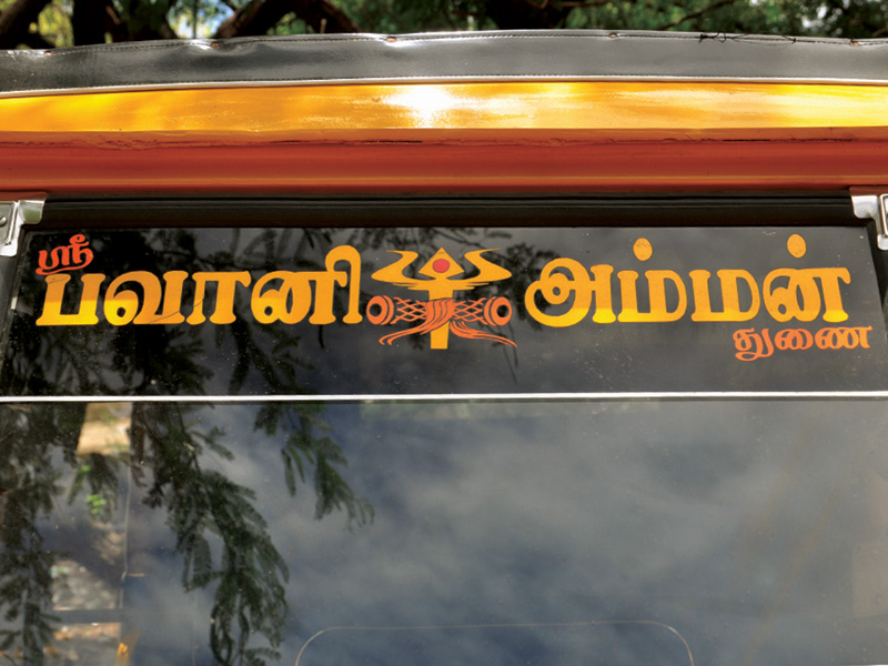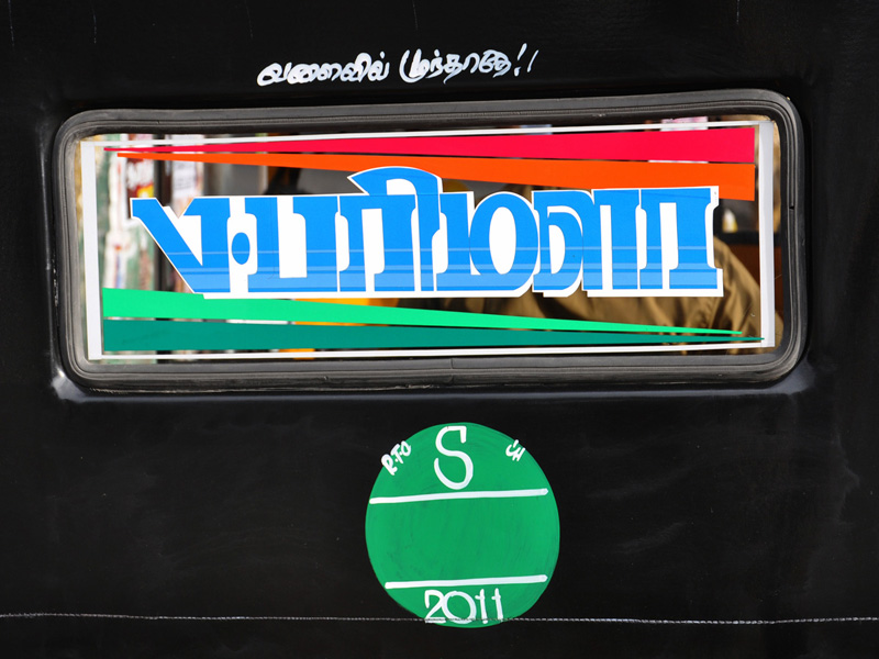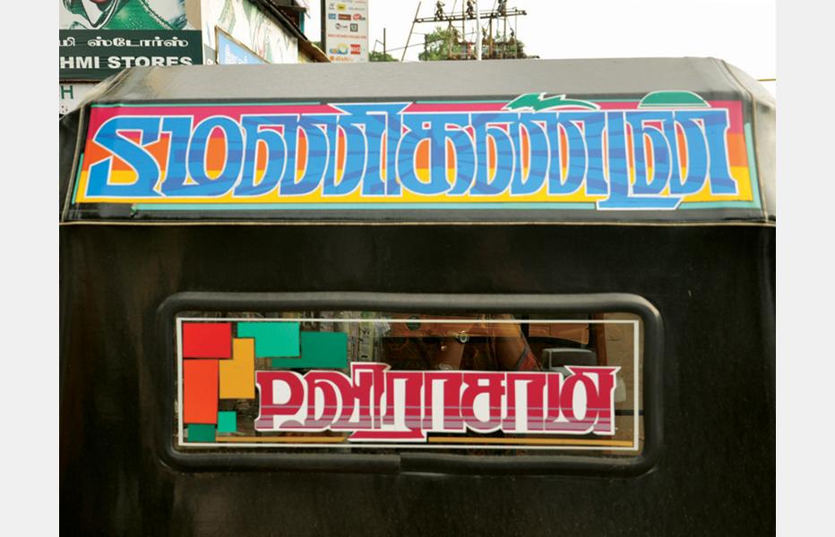 The displayed examples depict various kinds of Sticker Art that explore different typographic styles, colours, forms and expressions of Tamil language in the information displays on the autoricks of Chennai. These stickers exhibit letterforms in stripes, blocks, multiple colours, letterforms juxtaposed with various political, religious and personalized symbols. These vivid coloured sticker letters are available as simple forms or are sometimes hand-cut from reflective adhesive material (generally used material being Radium Vinyl, since it reflects the light. The themes presented are mostly names of the autorick owner, Gods and Goddesses, politicians, film stars etc. The most inviting aspect of Typography here are the expressive letterforms, coloured dimensional stripes and geometric patterns endowing the letters with curious dimensionality and illusion.
