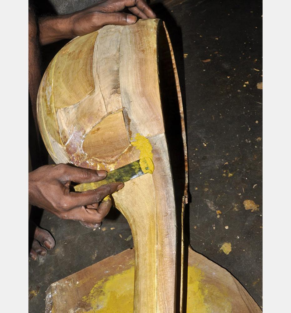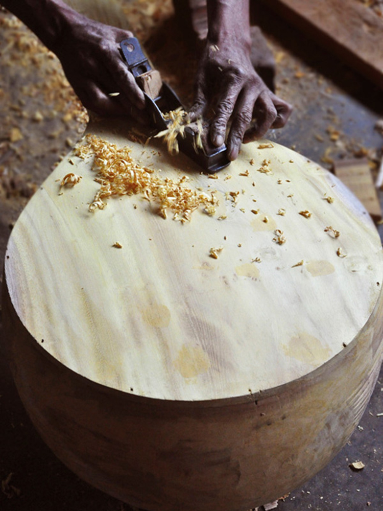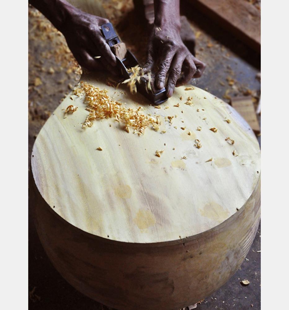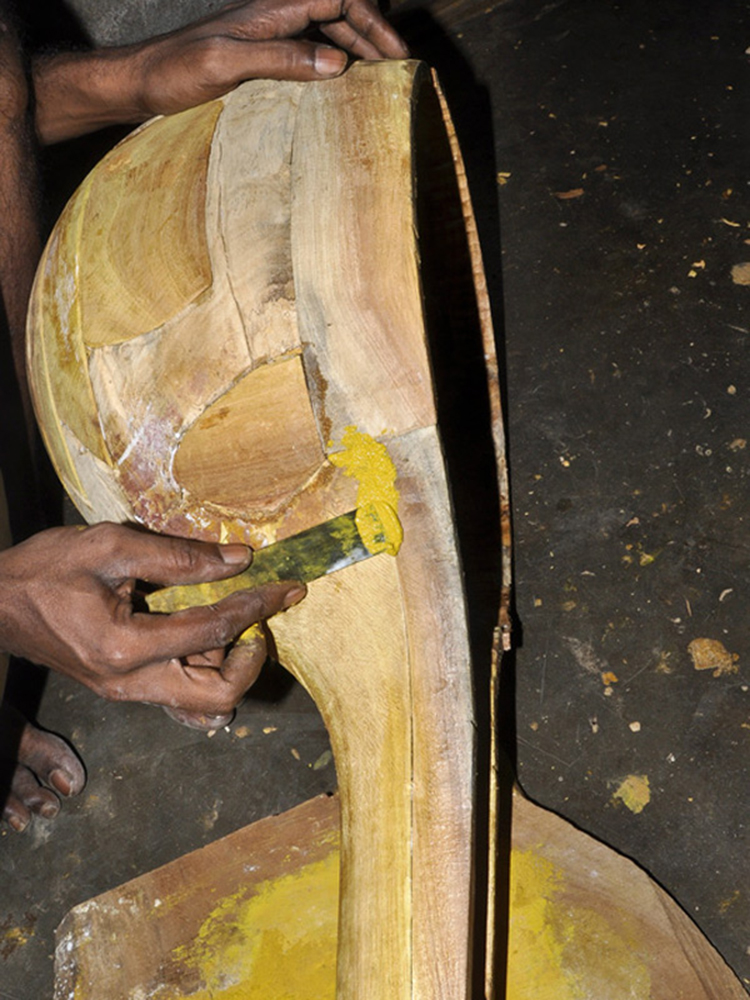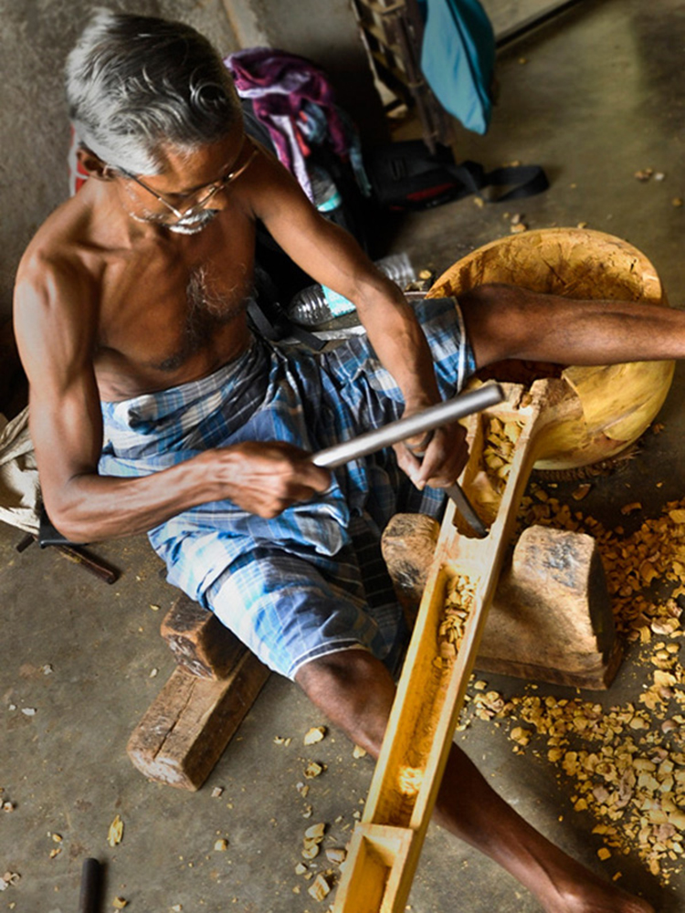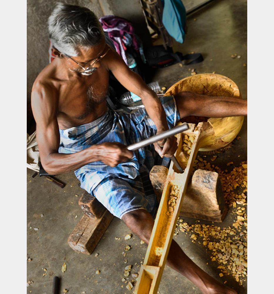 Veena making process involves many stages with team work of artisans. The traditional instrument making process begins with carving a single log of wood into veena’s base. Jackfruit wood is used to make the veena. The process of making veena is very much precise and it takes at least 3 to 4 days to complete one complete veena. Jackfruit wood (Pala Maram) is procured from market and kept for seasoning and maturing. Jackfruit wood is easy to carve when the wood is moist; once the wood becomes dry it’s hard to carve with it.