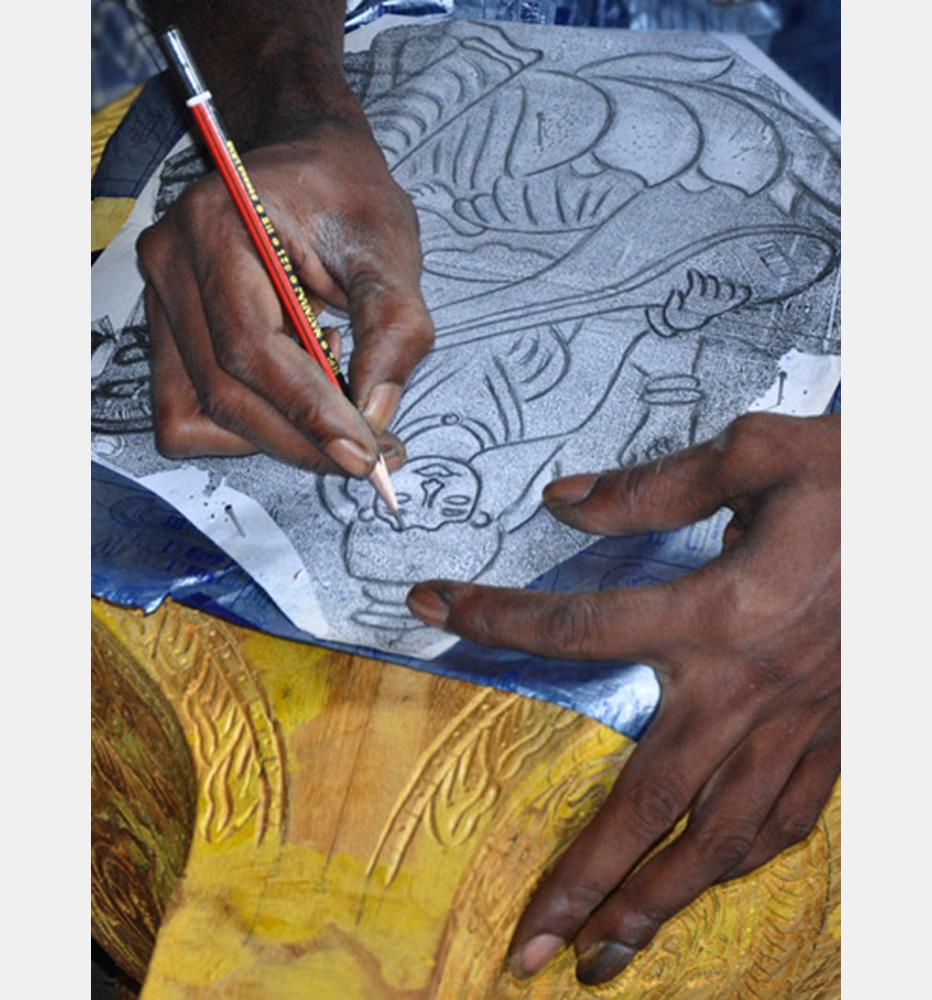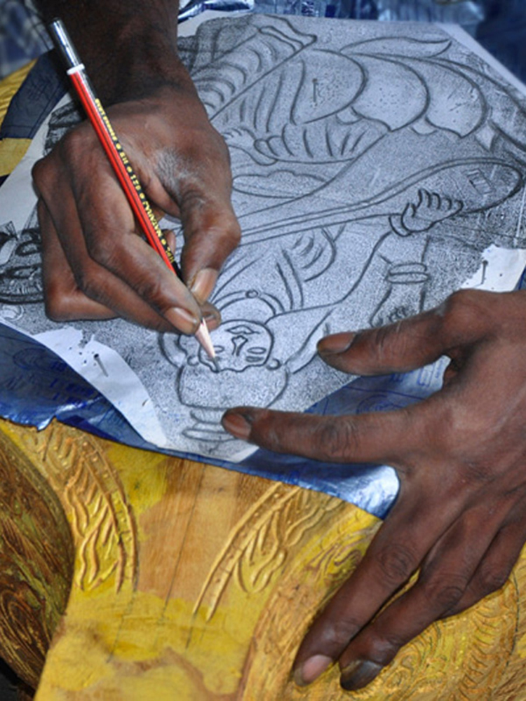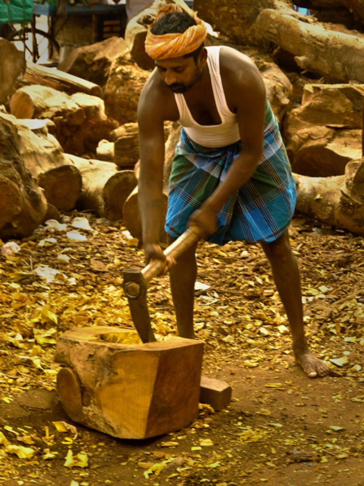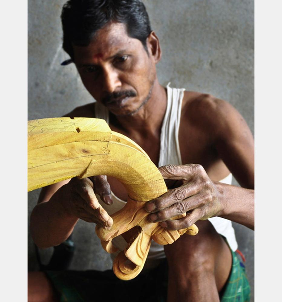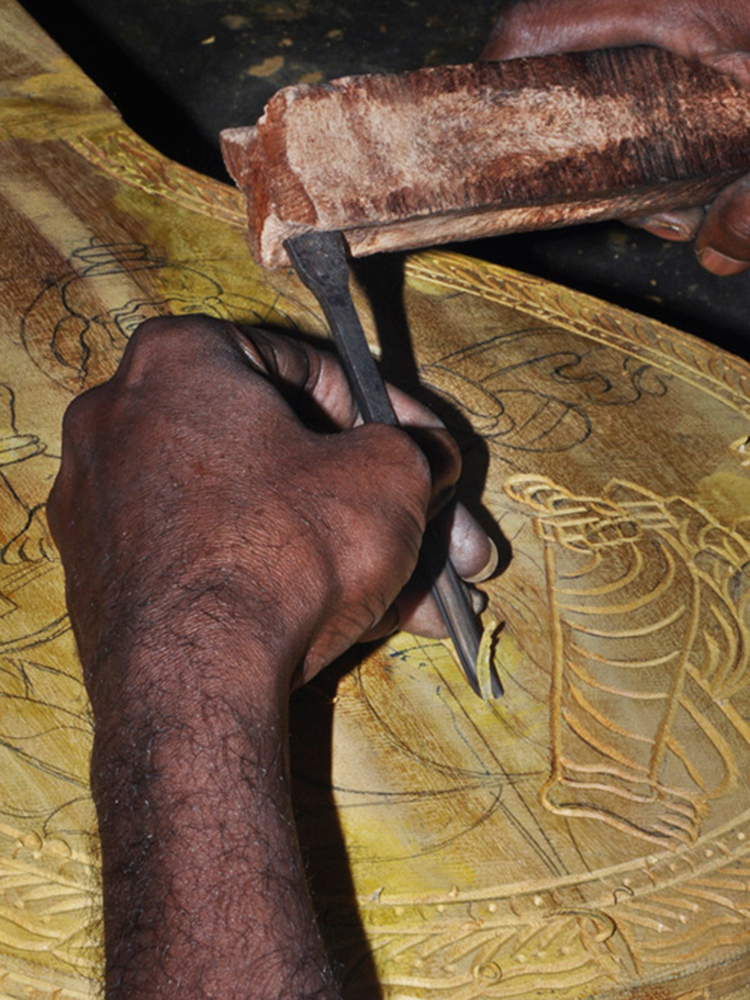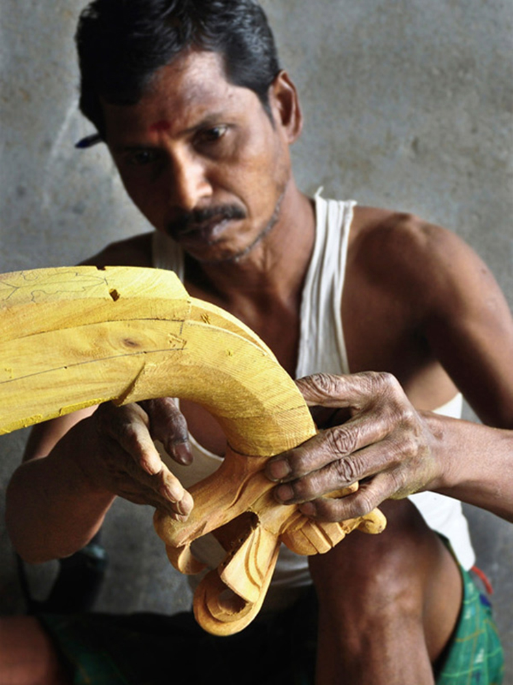 Veena making process involves many stages with team work of artisans. The traditional instrument making process begins with carving a single log of wood into veena’s base. Jackfruit wood is used to make the veena. The process of making veena is very much precise and it takes at least 3 to 4 days to complete one complete veena. Jackfruit wood (Pala Maram) is procured from market and kept for seasoning and maturing. Jackfruit wood is easy to carve when the wood is moist; once the wood becomes dry it’s hard to carve with it.