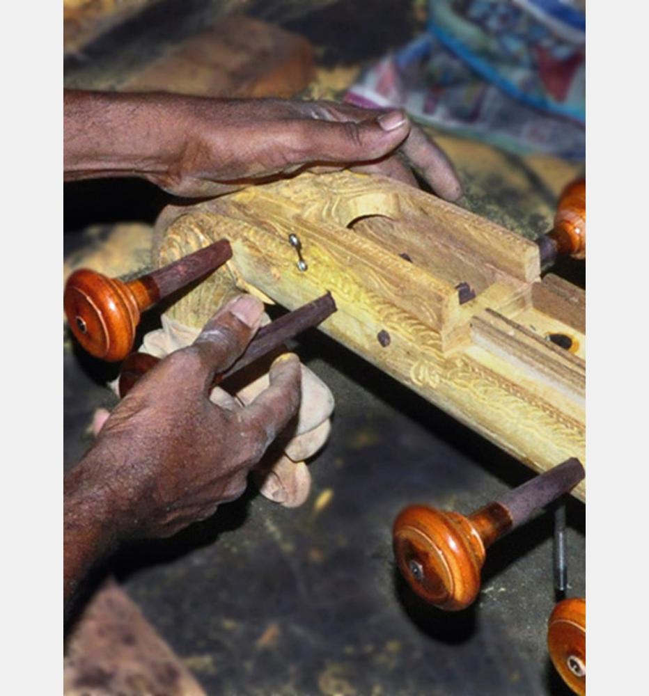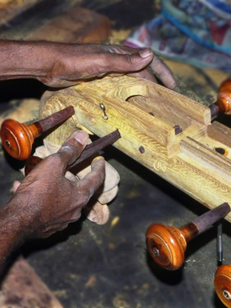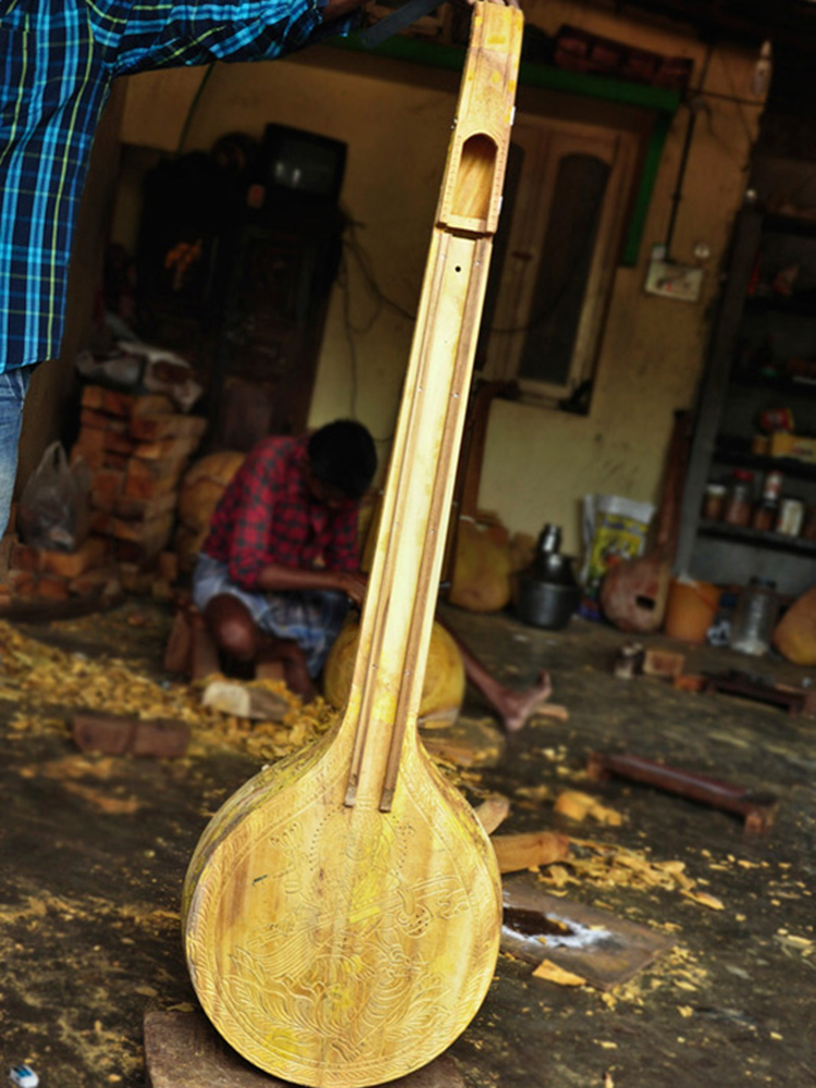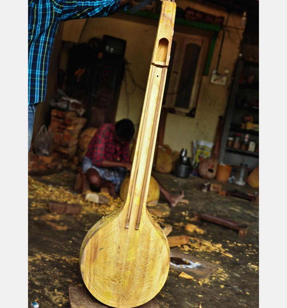 Veena is a traditional and classical musical instrument of India. Music and dance play a vital role in the cultural life of Tamil Nadu; Veena Playing is one among them. Hence, veena making has become major craft of Thanjavur. The veena is four feet in length consisting of a large resonator (tumba), a wooden bridge (Mettu), a tapering hollow neck (dandi), a smaller non-functional resonator and seven strings of the Veena.