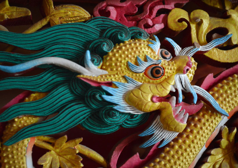Woodwork within the interiors of the monasteries is the best example of the Ladakhi tradition of carving wood. The most ubiquitous piece of furniture amongst Ladakhi homes and monasteries is the 'chokste'. The 'chokste' is a low heighted wooden table oblong in shape that measures approximately 3 ft by 1.5 ft in size. It is intricately carved and finely painted in vivid colors, bringing out the auspicious dragons and symbols of Buddhism. The heavily ornamental carving is done upon soft wood, which is either simply polished, or is painted and then varnished. Floral motifs, patterns derived from the swastika, an amalgamation of the eight Buddhist symbols, auspicious animals like the lion, dragon and the Garuda deity along with peacocks can be found frequently carved upon tables, linings above the traditional windows, pillars and banisters. Contrasting to the grays of the landscapes; the woodwork is usually vibrantly painted, almost as a strong reaction to it. However, the simplicity of the natural, unpainted, polished carvings is also subtly overpowering. The Lasthang monastery, also residence or 'potala' of the Dalai Lama demonstrates clearly how the entire look and feel of the space has been dominated by intricately done wooden carvings that cover every inch of the monastery walls.