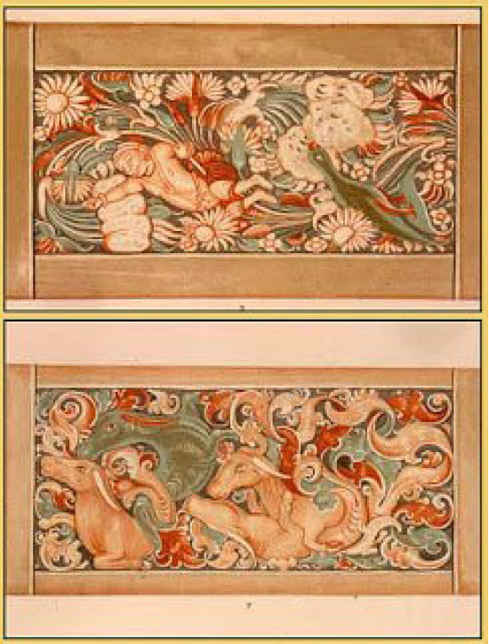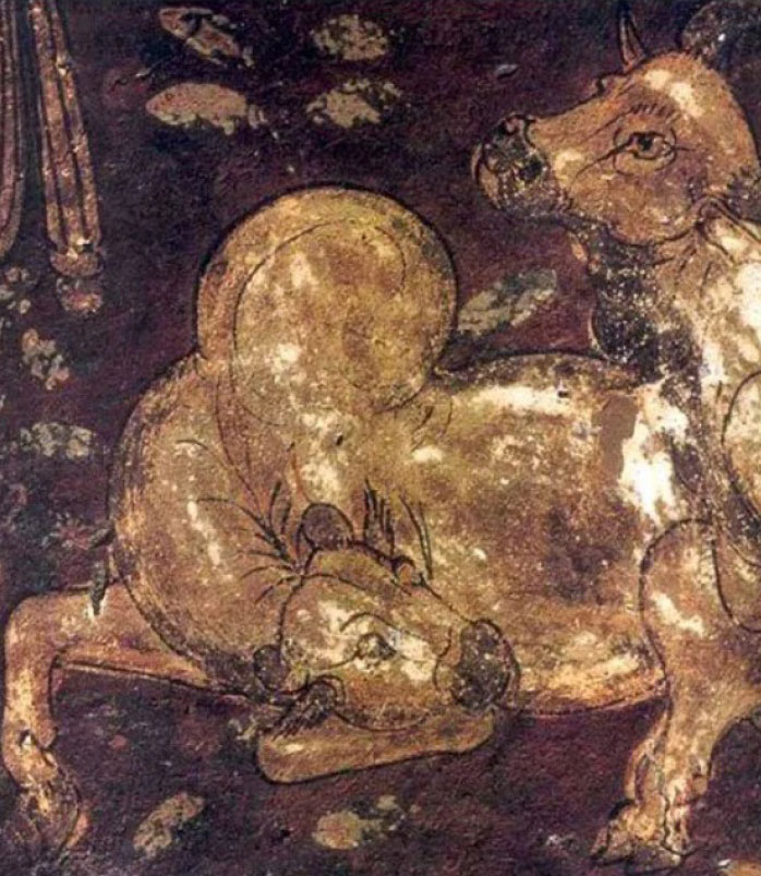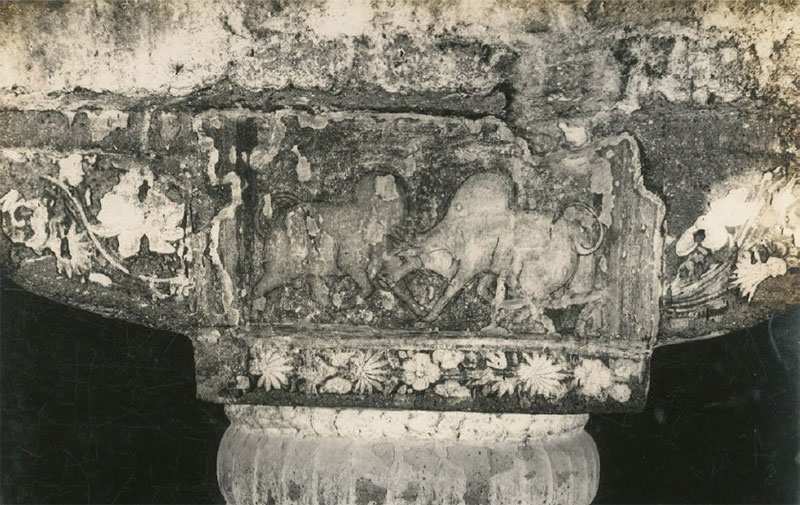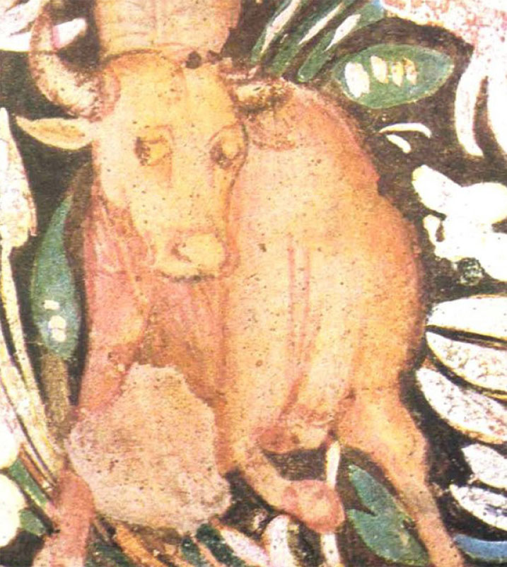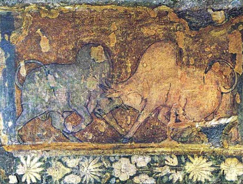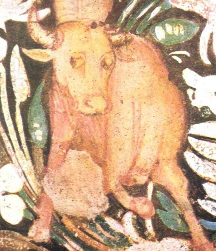 The paintings are made in fresco technique here many animals are depicted at required places. Bull is not depicted as the part of the composition but as decoration or design.