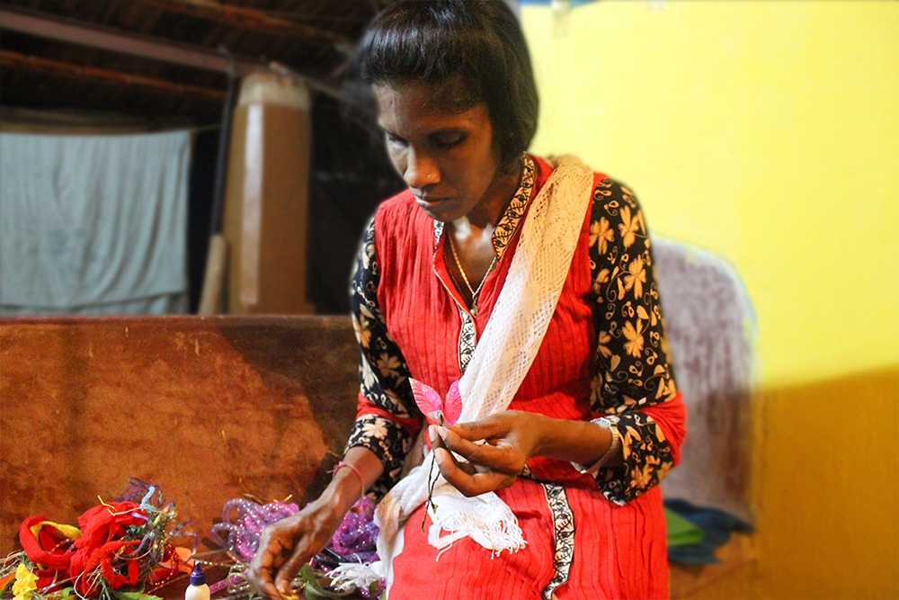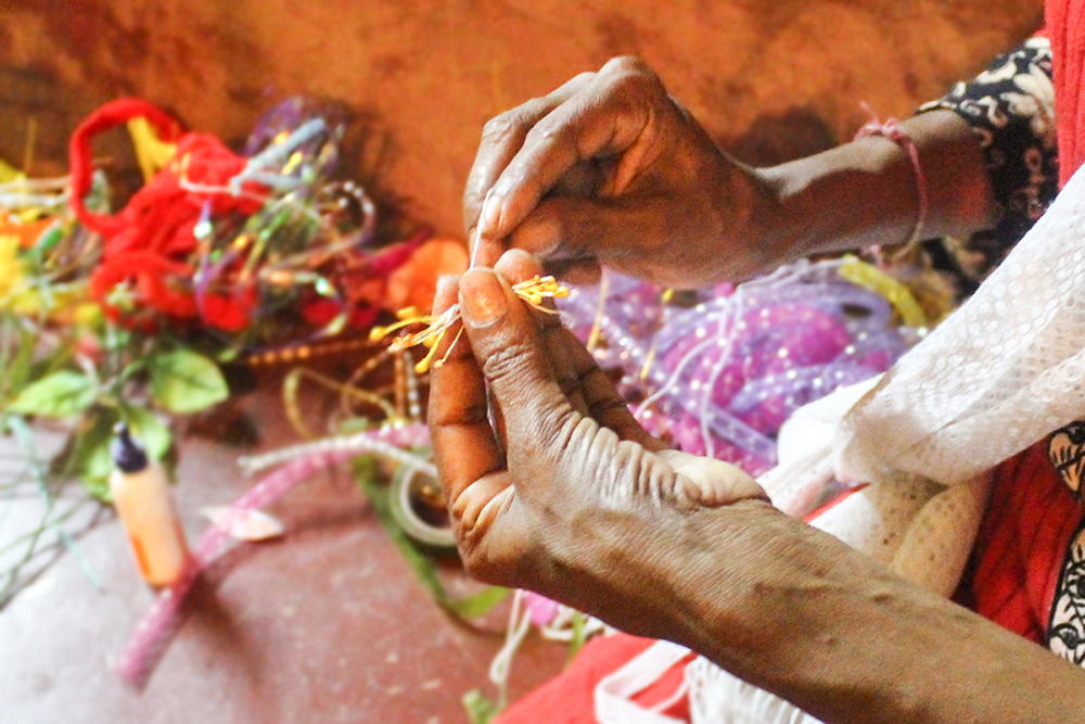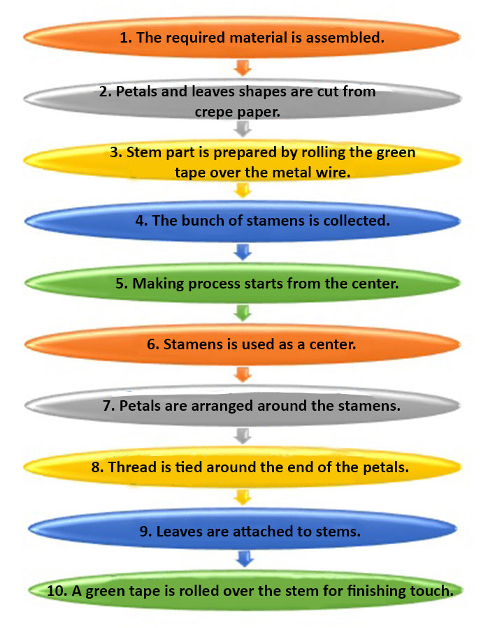Flower making is a simple process. Firstly papers are cut and shaped into suitable forms to make the leaves and petals. The process can be done by using scissors. The petals and other parts of the flower are then assembled, and the flower is assembled up from the center. Lastly, the flower and leaves are mounted and attached to a stem. The stem is made of brass or iron wire with a green-colored material wrapped around it.