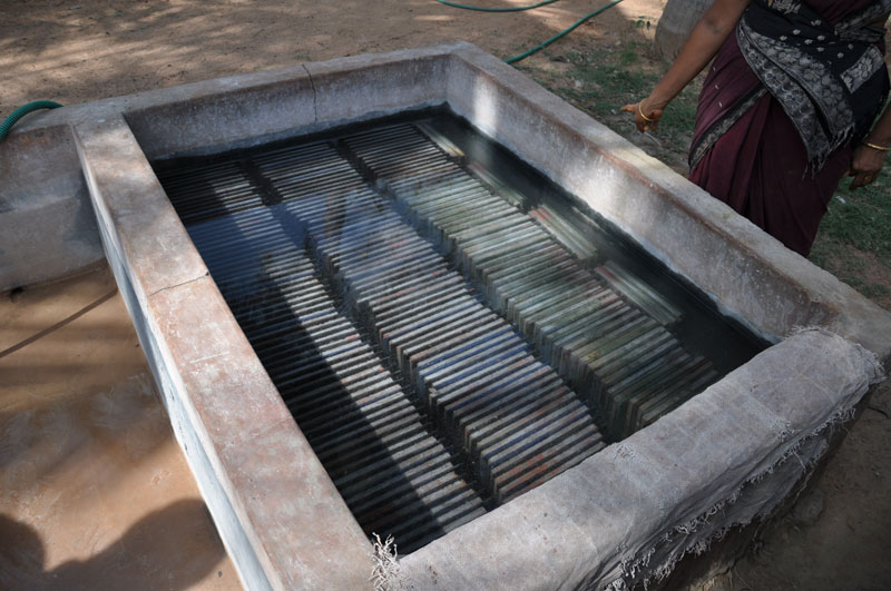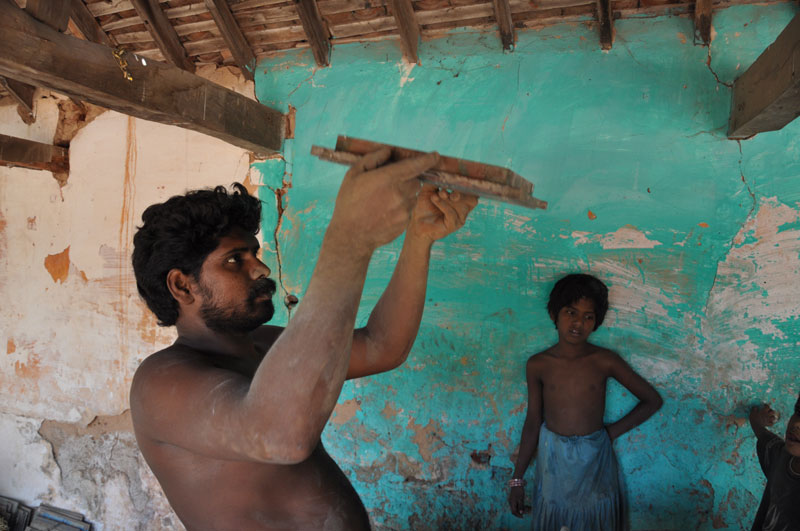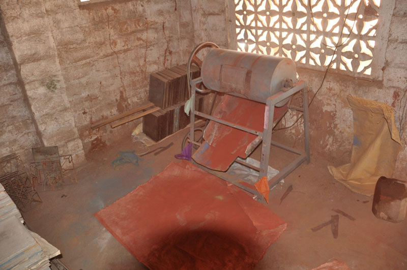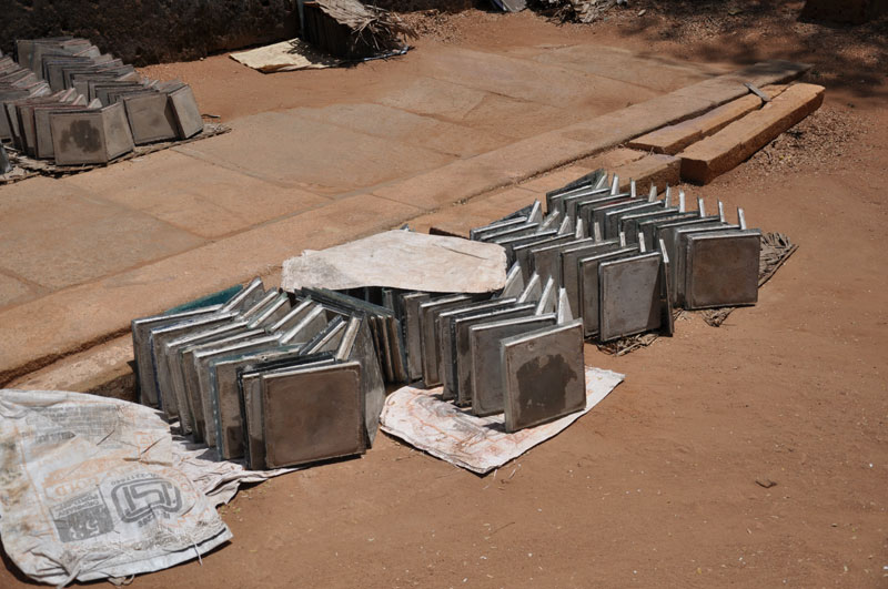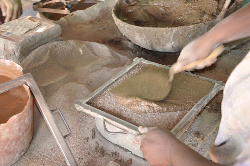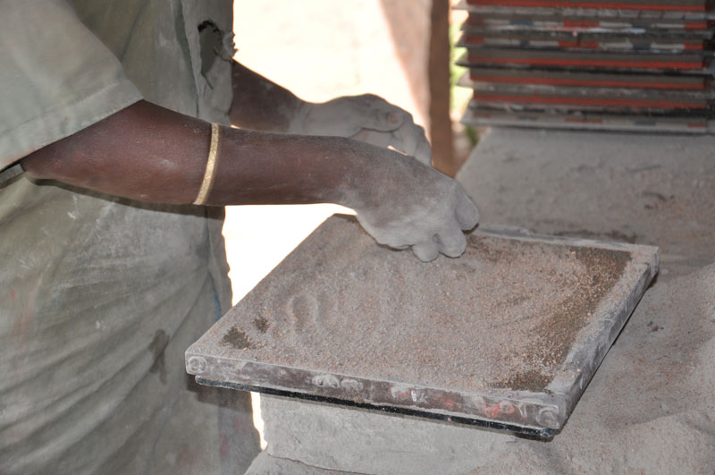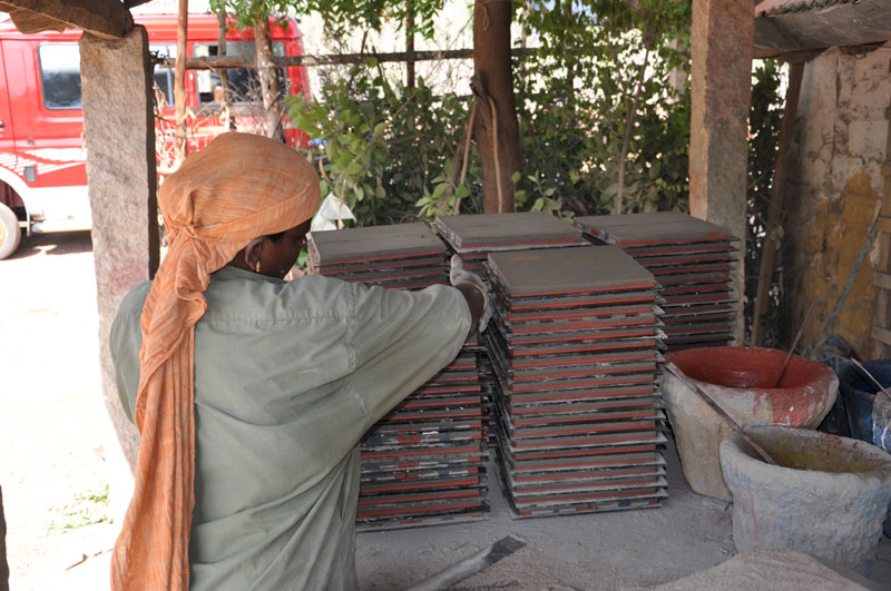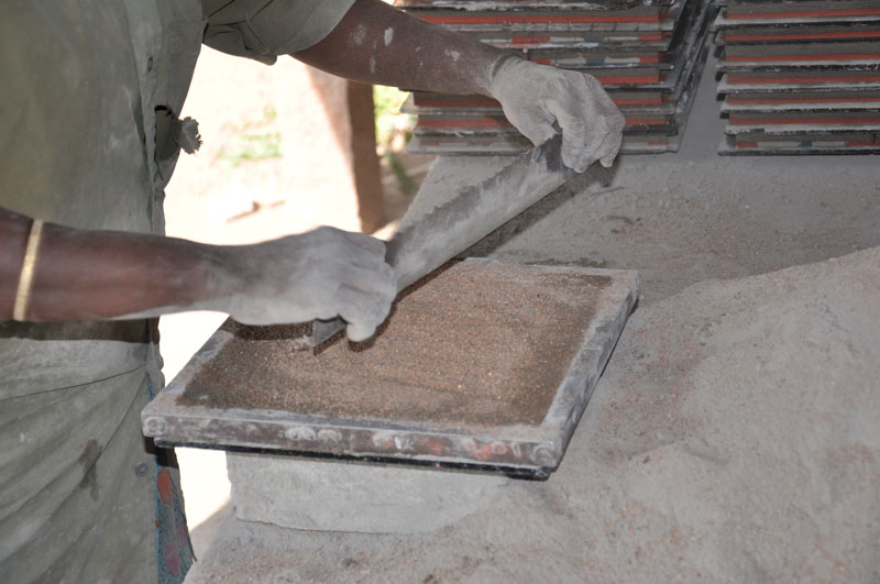 A mixture of sand, cement and baby jelly is prepared with bare-hands. Thereafter a layer of mortar is spread on the tile with the help of a spade and the tile is leveled. Extra cement is removed with the help of blade. The frame is eased out from the tile after the cement is partially set. The tile is dried overnight and dipped in a water tank for curing. It is then taken out and the edges are finished.