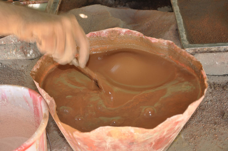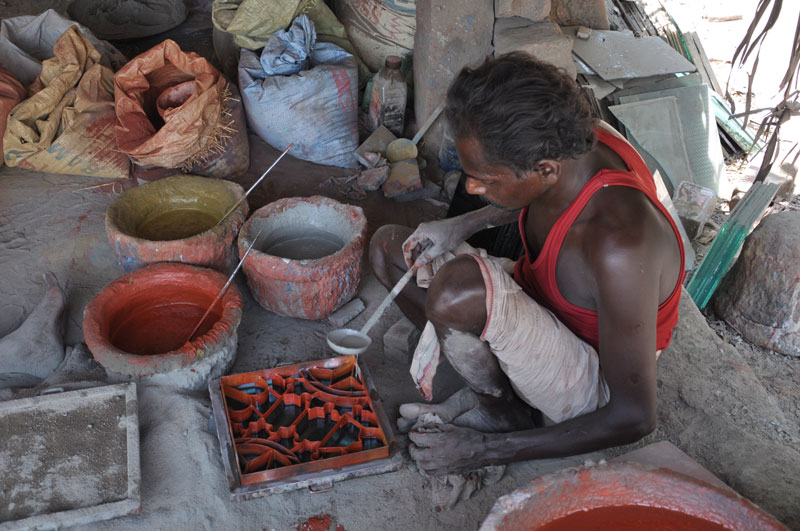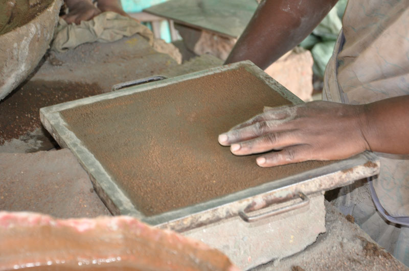 The manufacturing process is carried out with immense skill and precision. This simple yet dexterous process involves creating the tile from scratch to the point of creating designs and finishing the product. Locally procured sand and clay are sieved/ filtered together and then grinded to form fine powder. Cement is mixed with water and then converted into dough. Glass frames are cleans and placed on a raised structure. A square wooden frame is placed over the glass to form the tile.