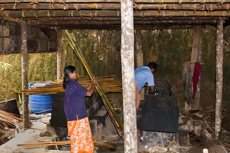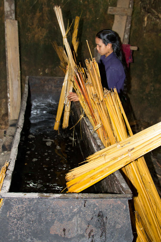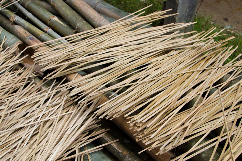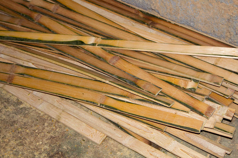 After final drying of bamboos they are further sliced into thin strips as per the requirement in weaving of furniture. Bamboos are cut into thin strips using slivering machine and then further with using hand tools. These strips are again kept under the sun for drying. Thereafter using small kati women further smoothen the strips. This process is called as silca removal.