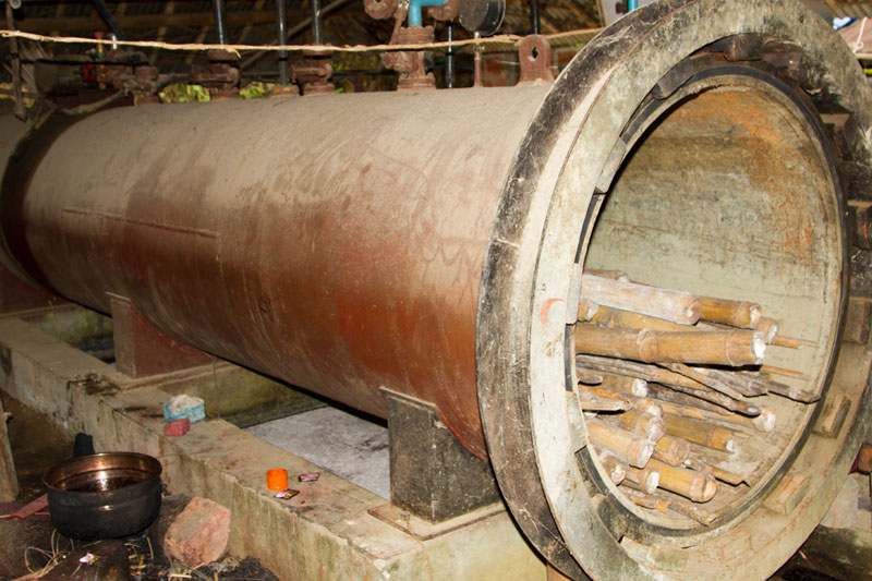 PTT is used to treat the bamboo against borer attacks. The plant can treat bamboo up to 20 feet tall. These bamboos are generally used for construction purposes. The tank is filled with bamboos (up to 60 poles) and supplied with steam mixed with 25 Boric acid solution and 2 % Borax chemicals in water. The whole process takes up to 3 hours. After the treatment the tank is opened after 2-3 hours so that the temperature inside is cooled down. Then the nitrogenous products, which ooze out of bamboo, are wiped out. The bamboo due to steam absorbs the chemicals and thus become borer or termite proof. The pieces are dried under the sun on the bed of sand. Sometimes they are also applied with 15 of sodium penta chlorophenete in alcohol to prevent further damage during monsoons. Small bamboos are boiled in large containers with the same chemicals in order to treat them. These bamboos are used for making curtains or weaving. In larger containers 1000 poles can be treated at a time. The process takes 2-3 hours and after that they are taken out the next day and then sun-dried to be used in the next stage. For burning scrap bamboo is used.