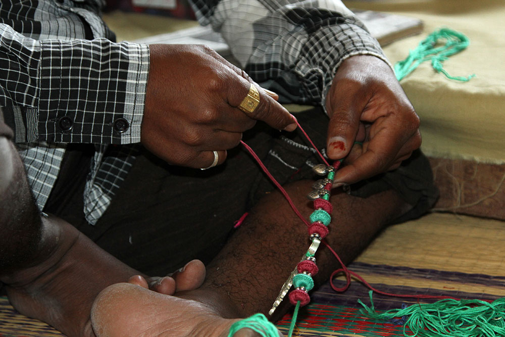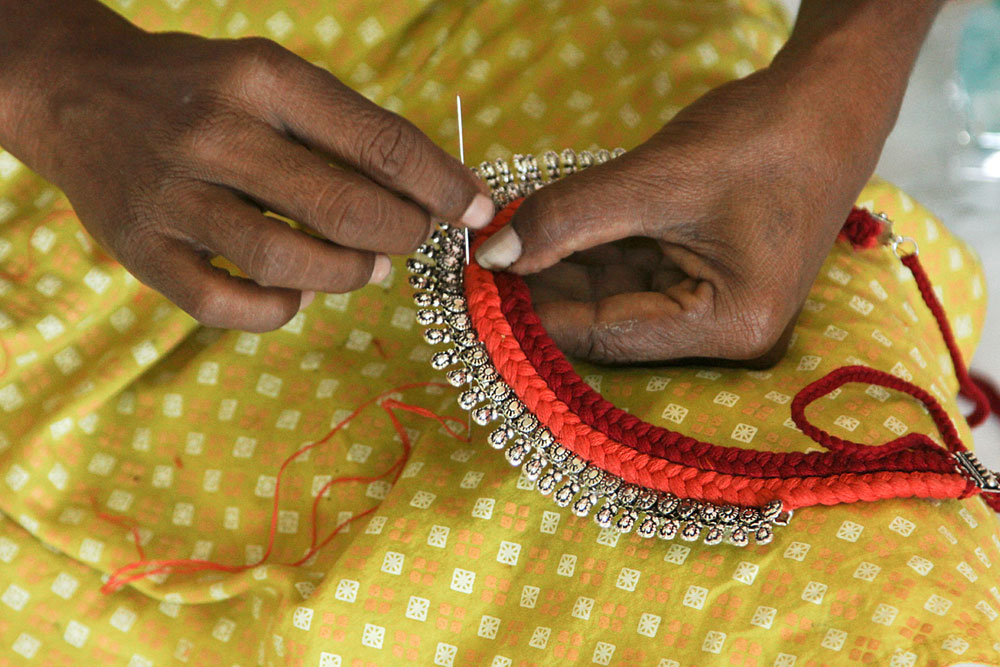 Community had retained their colourful, carefree typical traditions that refrained from mingling with the other communities as their main occupation once upon a time was cattle trading and transportation of agricultural goods. The traditionally attire of the Lambani/ Banjara reveals that they use more number of silver and locally available articles to generally portray their culture and style. The workers at (Sabala -NGO) Bijapur together singing a folk at the background in the local language that conveys the message how an individual can become a good person. Working together in making the handmade pattern of design with the coloured threads/ silver/ metals like copper & white metal.
