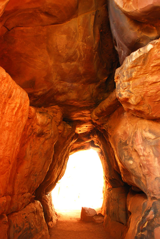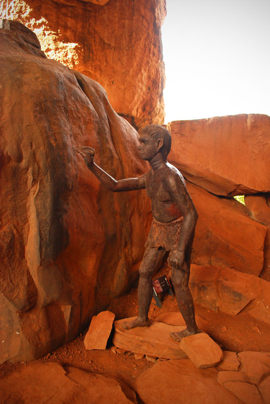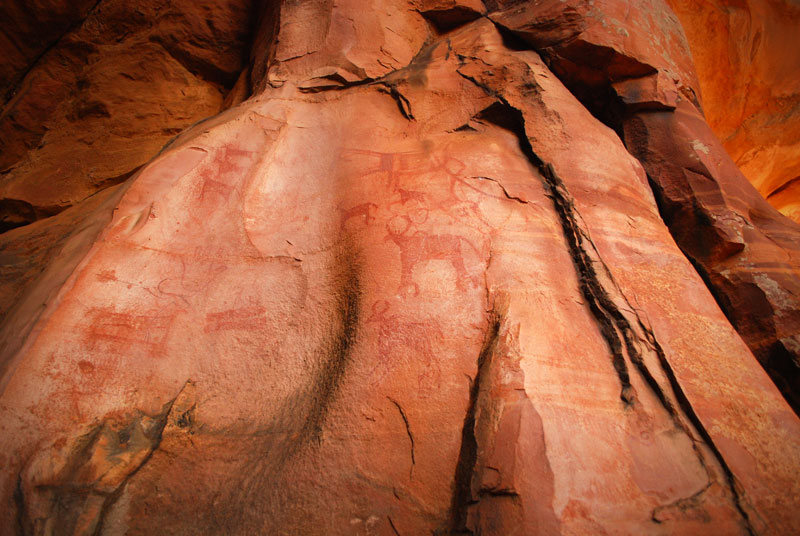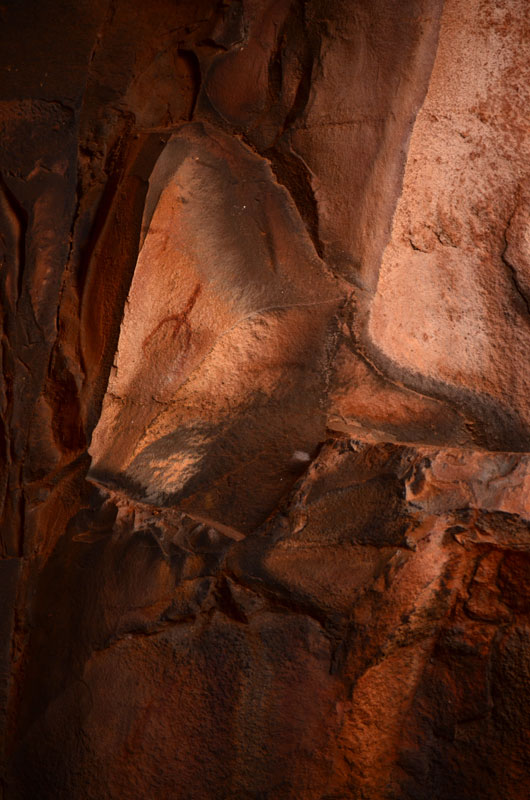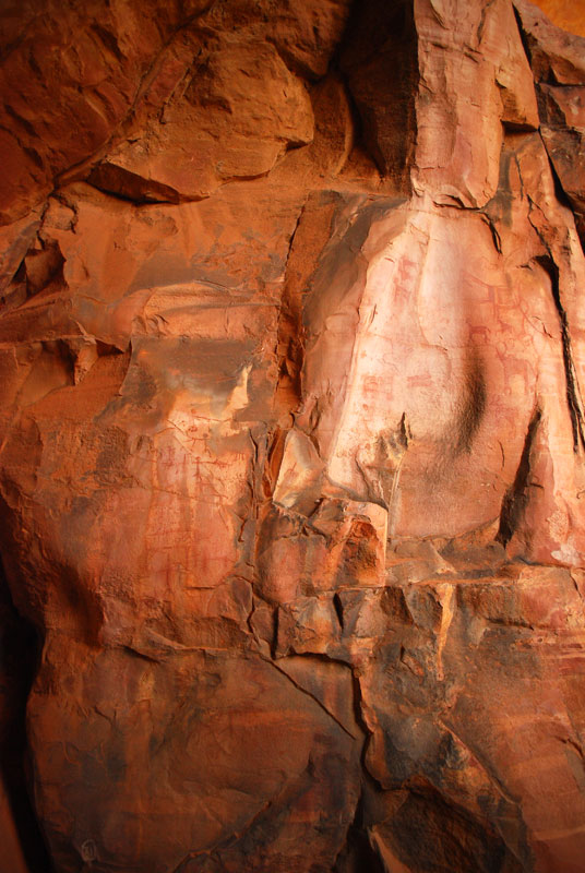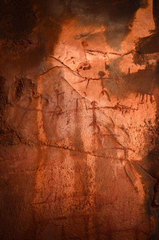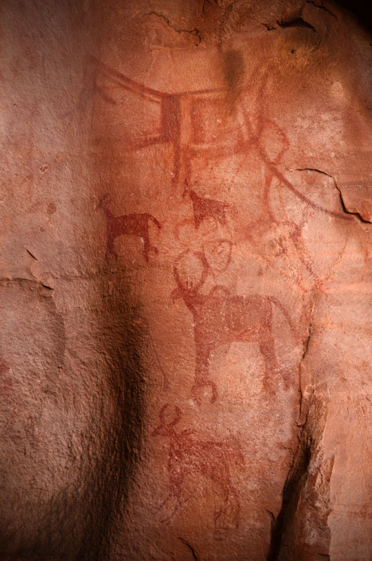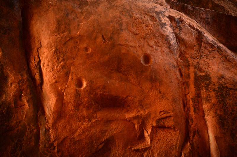 This shelter is known as Auditorium cave due to its form. The cave is 39 meters long, 4 meters wide and 17 meters high at the western end. The composition shows attractive illustrations of bulls, buffaloes, deer, antelopes, a peacock, a tiger, and an unfinished basket like object depicted over faded lines. It also displays a left hand print of a child, which is the only example of a hand shown in outline. A number of various other human and animal figures are depicted in line drawings. The cave has a number of cupules depressions on stone, associated with Lower Paleolithic period.
