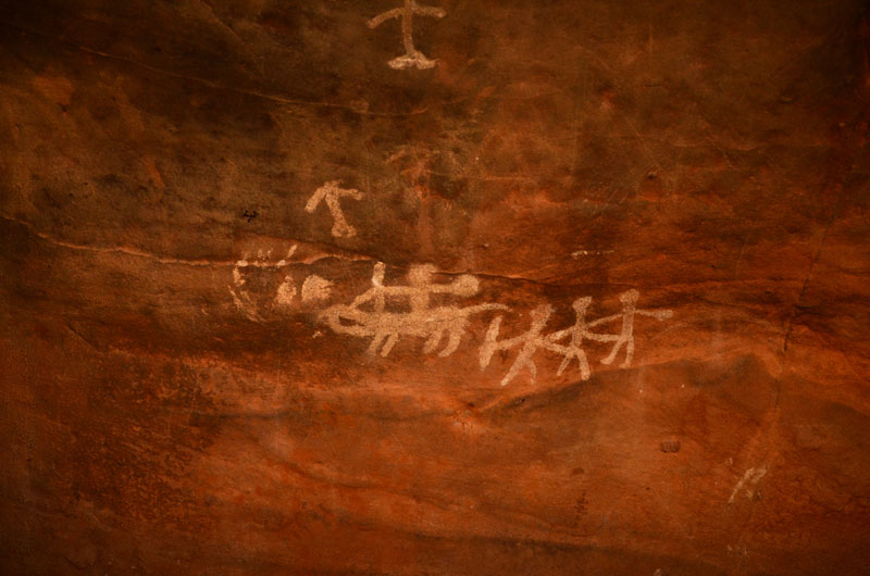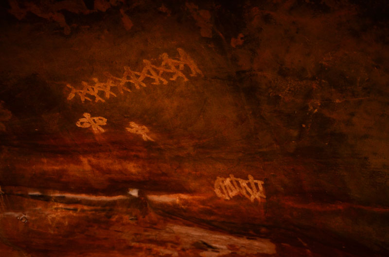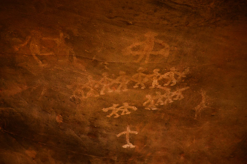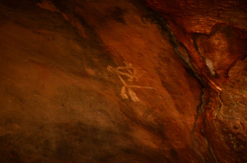 This shelter comprises of beautifully designed, natural looking animal figures in white color. The figures of dancers, drummers and horse riders can be seen. The paintings have three different layers of superimpositions, with the earlier ones faintly visible. The drawing of eight stick-shaped men dancing arm in arm, a dancer and another group of three dancers are drawn here. One more group of illustration comprises fourteen figures of dancers and one figure of a drummer. The dancers are shown with joined arms in three groups of eight, four, and two, and the drummer holding a drum with broad ends is painted above the dancers. Below this depiction, are two isolated human figures, two human figures on a horse followed by three individuals.