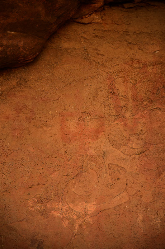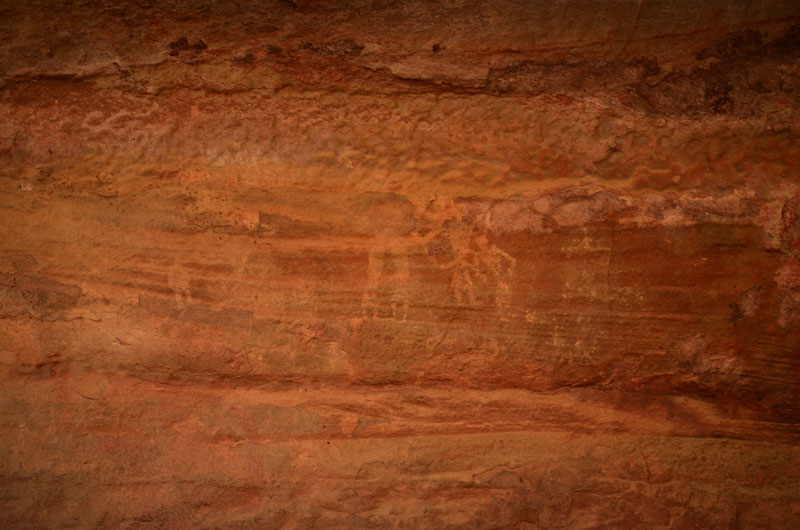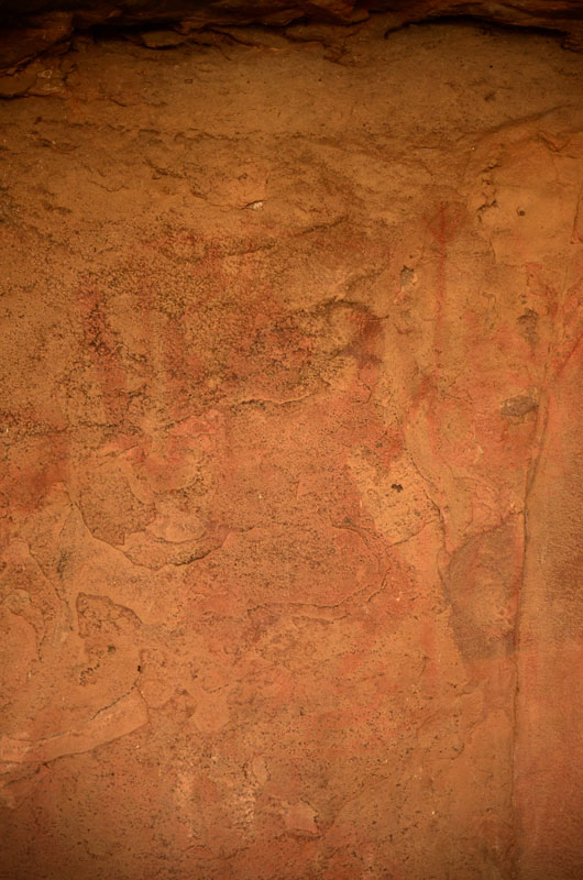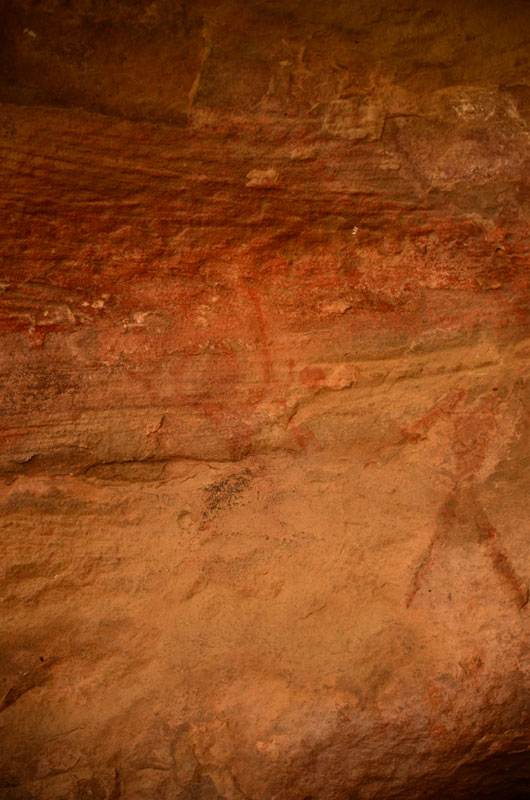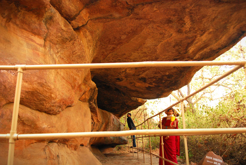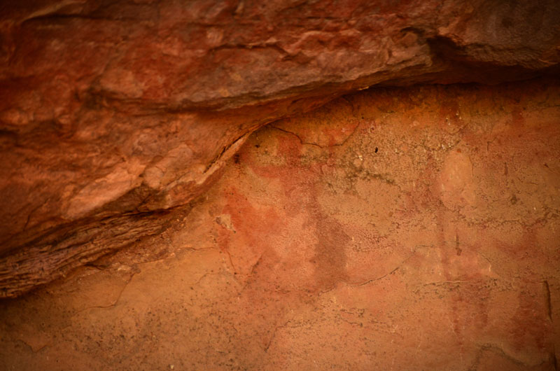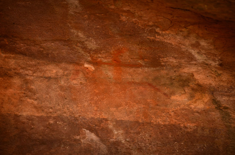 The figures in this shelter are dull and require patient observation from its viewers. Illustrations of a horse rider, a king worshipping Shiva lingam, Nandi and Ganesha painted in red color; can be seen here. White color paintings of bird, swordsman, deer, drummers and dancers are also visible.
