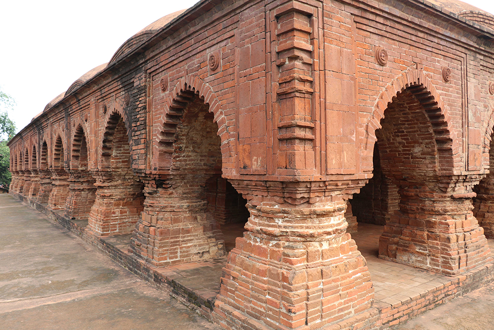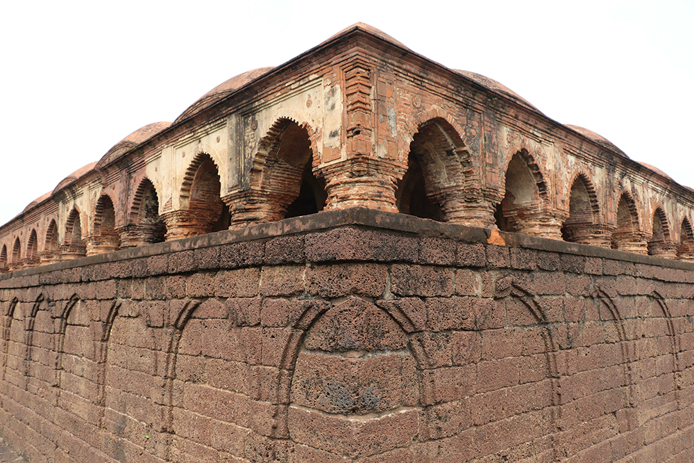 Rasmancha is an important monument in the Vaishnavite tradition. Idols from various nearby temples were brought here and Ras carnival was celebrated. The square platform is about 24.5 meters in length and the temple is about 10.7 meters in height. Beautiful arches and columns in terracotta create 3 ambulatory paths around the sanctum sanctorum. Here we can see laterite as well as terracotta being used in unison. Lotus motifs on arches and hut shaped turrets.