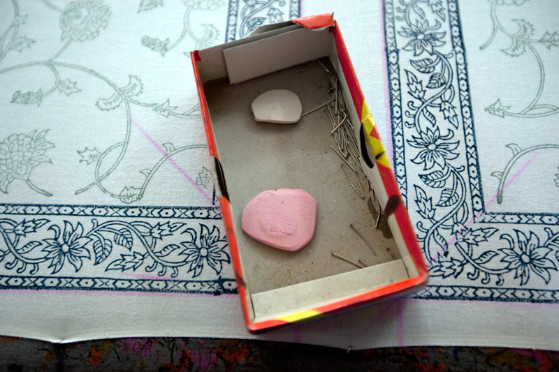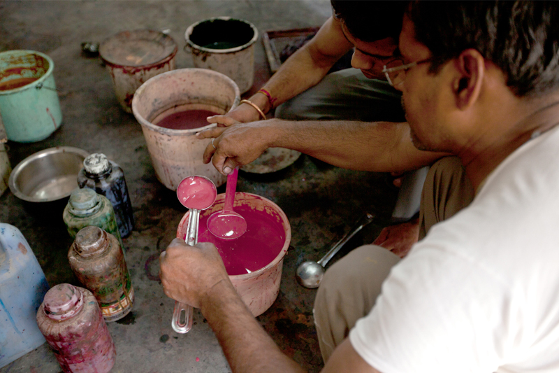 Colors used for printing are kept in a wooded tray called as saaj. Once the color is poured into the tray wire mesh is placed inside. This mesh is covered with a piece of felt. Felt soaks the color and finally a fine cotton/malmal cloth is placed on the felt. This preparation helps in proper application of color on the block.