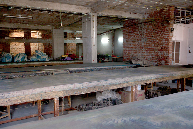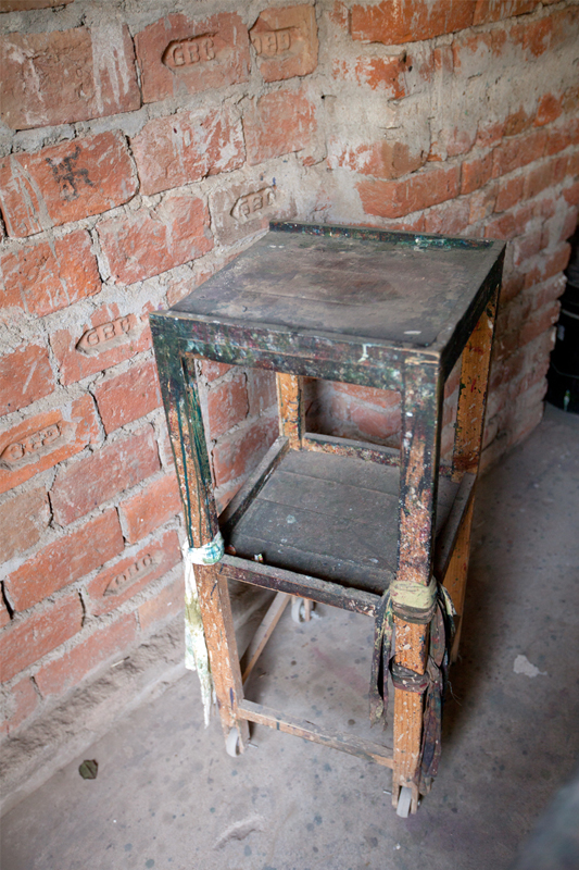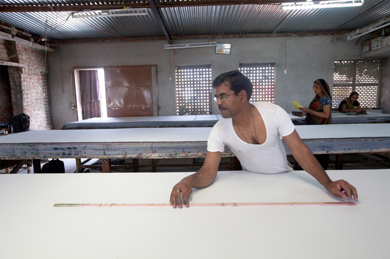 These are specially made tables measuring approximately 3 feet high, 3 feet wide and 9 feet long. The surfaces of the tables are covered with several layers of cloth, jute and canvas which help in better printing. These tables allow 3-4 printers standing and working simultaneously. Traditionally these tables were of low height approximately 1 feet high, 2 feet wide and 5 feet long. The printer used to sit on ground and print.