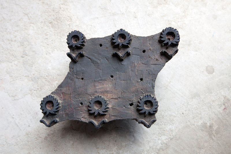 For making intricate patterns and getting high level of clarity in prints metal blocks are used. These blocks are made by engraving thin sheets of evenly cut metal strips into the wooden blocks. The metal strips are beaten to make them thin and then strips are cut of even length. The design is drawn on the wooden block and the metal strips are pressed onto the design by gentle hammering. Filling of the designs is done from center to outside. Once made the blocks are checked to see the strips are of the same height from the wooden base. Metal blocks are costly, time consuming but long lasting.