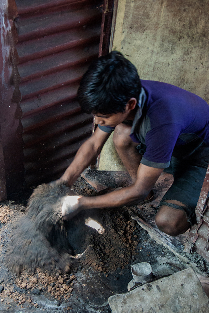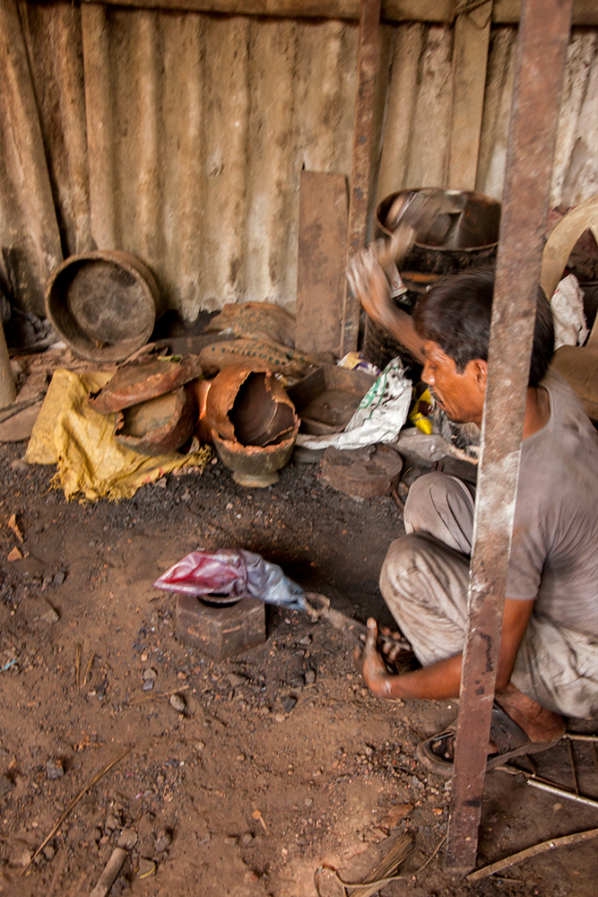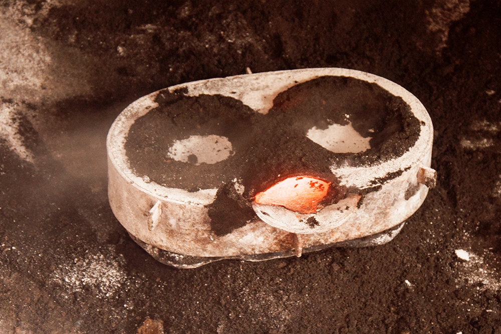 Once the mold is ready the furnace is set up and the metals are melted in a crucible in a furnace. It takes about twenty minutes for small amount of metal to melt. Once it is melted the bigger grains and dust are removed. The crucible is held with tongs and carried to the molds. The molds are filled with molten metal. Castings are taken out after cooling the molds for few minutes. The castings are separated from sand and placed in water. The castings are buffed and polished to give a finished look.