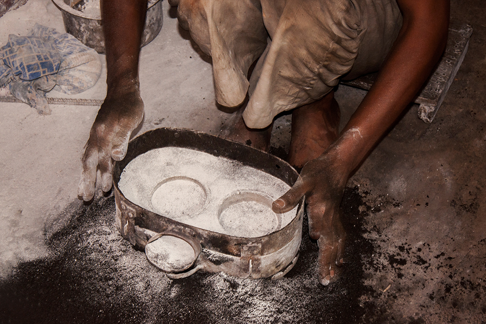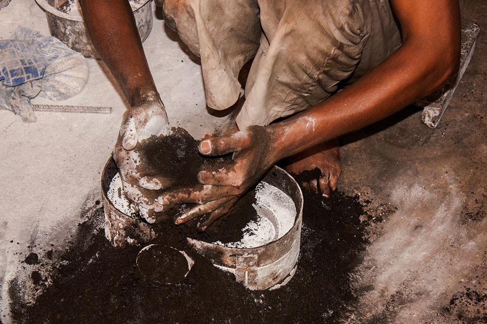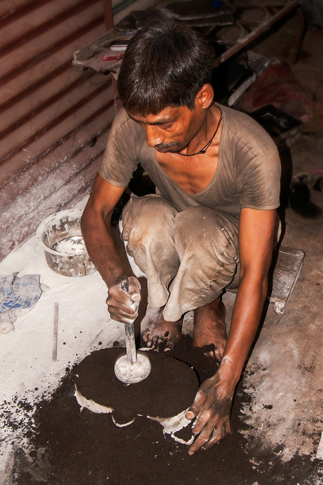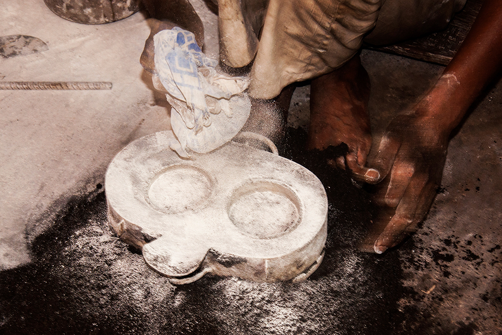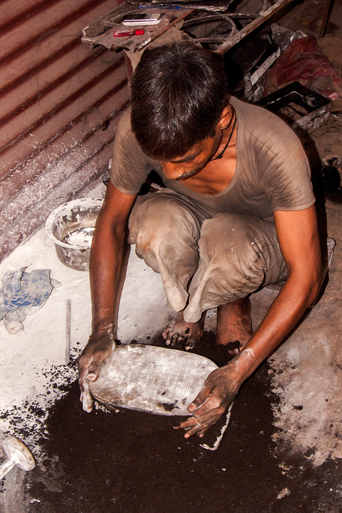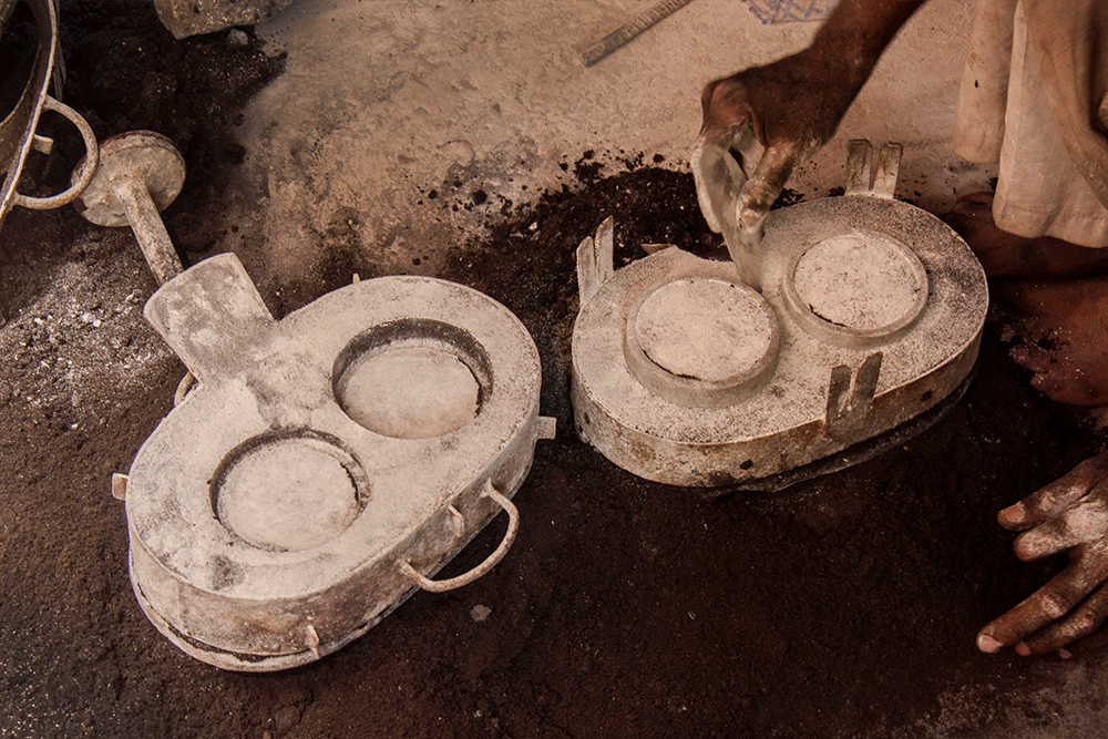 The molds are formed of desired even shape of a desired part. To create a mold – two or three kinds of soil (jungle soil) are mixed together along with a suitable bonding agent (usually clay). The wooden plank with design pattern is placed on ground, chalk powder is sprinkled on top of the design so that the sand mixture doesn’t hold onto it and the mold frame is placed on the plank, it is tightly filled with sand mixture and covered with another wooden plank on top. The wooden plank with the design pattern is below so it is turned upside down. The wooden plank is removed leaving the pattern in sand. Chalk powder is sprinkled on it and another box frame is placed tightly filling it with sand later. The box is covered with plain wooden plank after filling with sand. There are two box frames along with the pattern still inside. The first frame is slowly lifted and kept aside. The pattern is taken out and the two box frames are put back together after making a pathway for the molten metal to pass and is kept aside. In the same way number of molds are made for bulk production.
