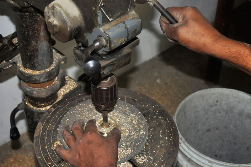 Lamp is one of the products made from brass which is an alloy of copper. Bride carrying the 'Kuthu Villakku' (sliver or brass oil lamp), to her in-law's house, as a symbol of bringing prosperity is a tradition practiced till date. These lamps come in varying styles Yaanai Villakku (elephant carrying a lamp), Thavalum Pillai (Crawling Krishna) and so on. Products like, diyas, bells etc. are made in brass to be used for poojas/worshipping and also for decorative purposes. Big, medium and small lamps are the types of lamps with varying size from 4inches to two feet. Oil lamp mainly consists of 3 parts -