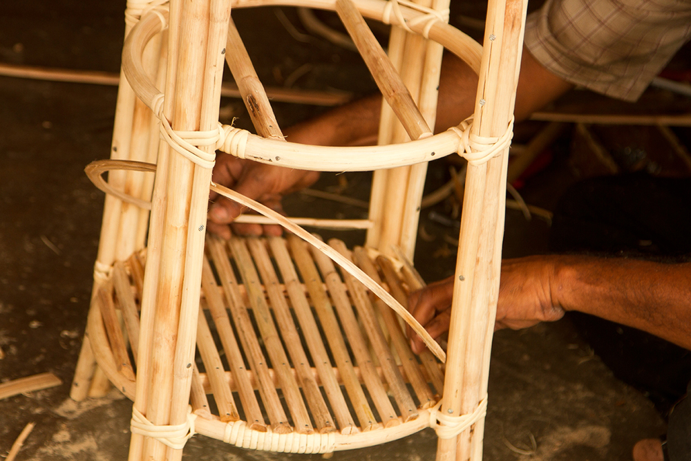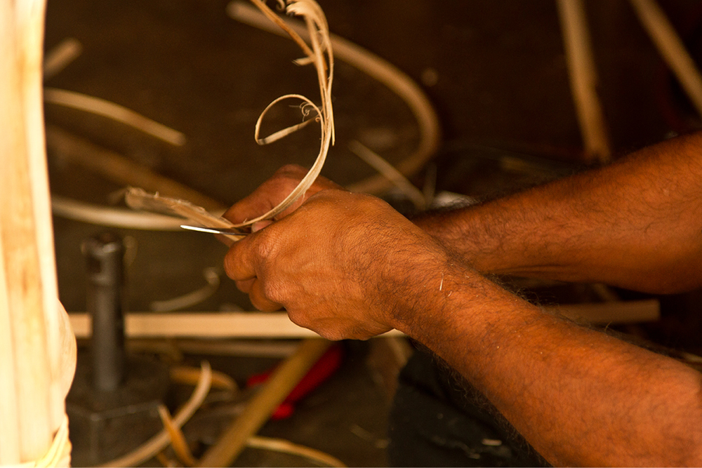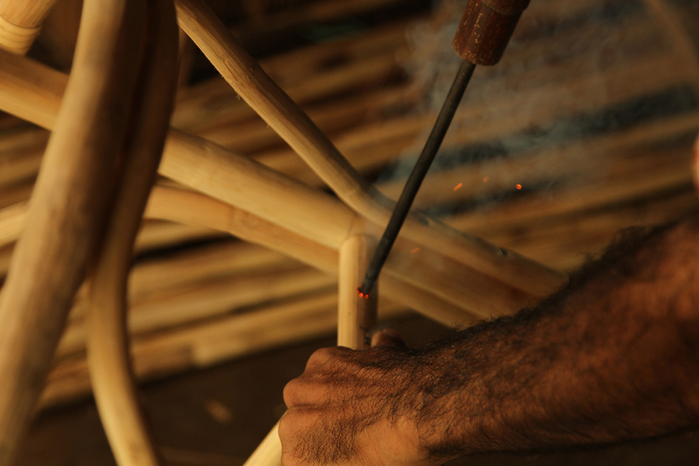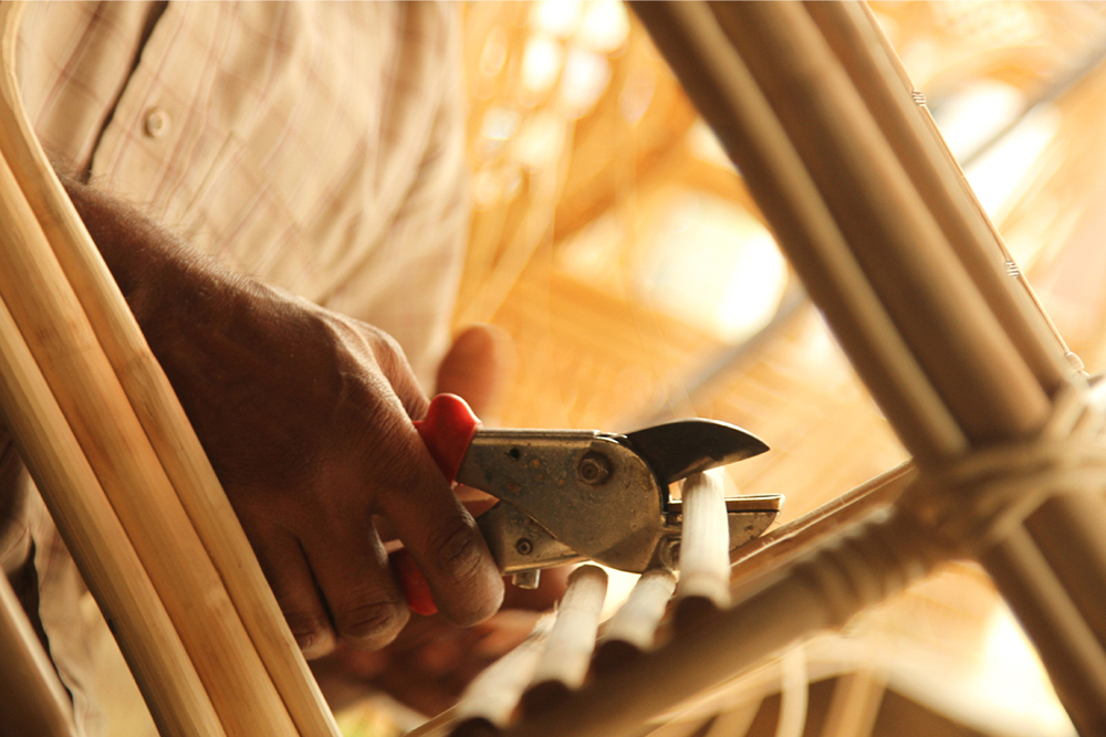 Rattan is a long stem of certain trailing or climbing palms. They are rated as minor forest products, in spite of the fact that they are probably the most important forest products, after timber. They belong principally to the palm family of the genus Calamus, but a few other related genera like Daenonorops, Ceratolobus, Plectocomia and Koerthalsia yield canes of lesser importance. The internodes vary in length and thickness in different species and even in different plants of the same species. The core of the stem which are soft and spongy, are made up of coarse fibers. The first step is skinning the surface of the rattan. With the help of a sharp knife outer skin of the stem and the knots are peeled and removed. The cane is cut into desired length. The stem is then heated using a blow torch and bending tool to bend the material into required shape which has limitation. Artisan arranges them together to build the basic frame (structure) of the furniture after bending. Base of the furniture is built first by nailing in the required form. After the parts of the furniture are nailed together in the required manner; the frame is then filled by binding the cane strips or thin rattan stems over the frames. The nailed joints are then tightly bound by lengths of split cane strips which acts as cover, both to cover the visible nails and to give additional rigidity. The binding details sometimes have a decorative quality. Clear varnish, enamel paints are applied over the finished product. Generally the natural surface of the cane is retained without any surfaces application. Rattan accepts colors and it can be worked into many styles.