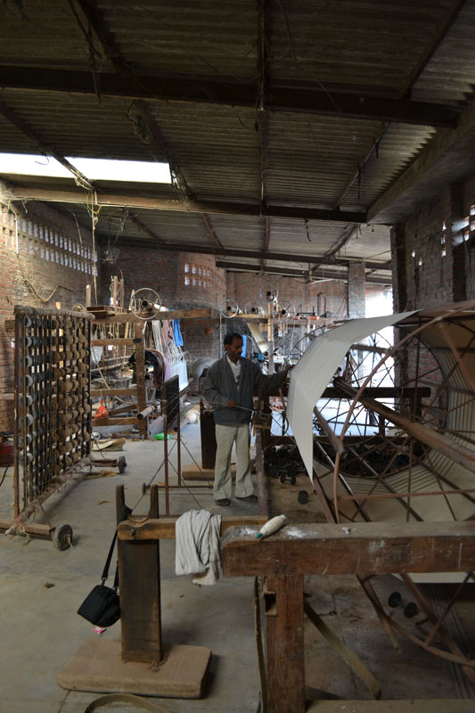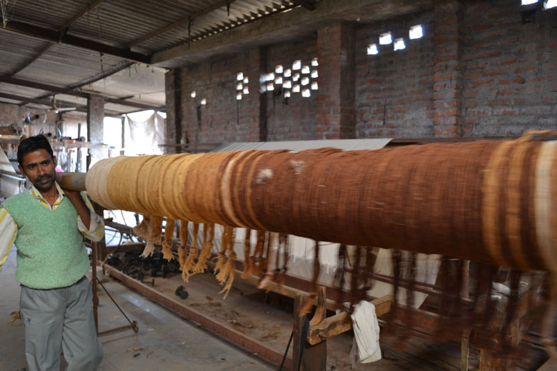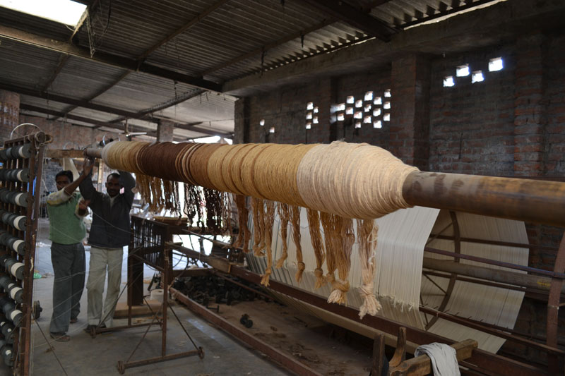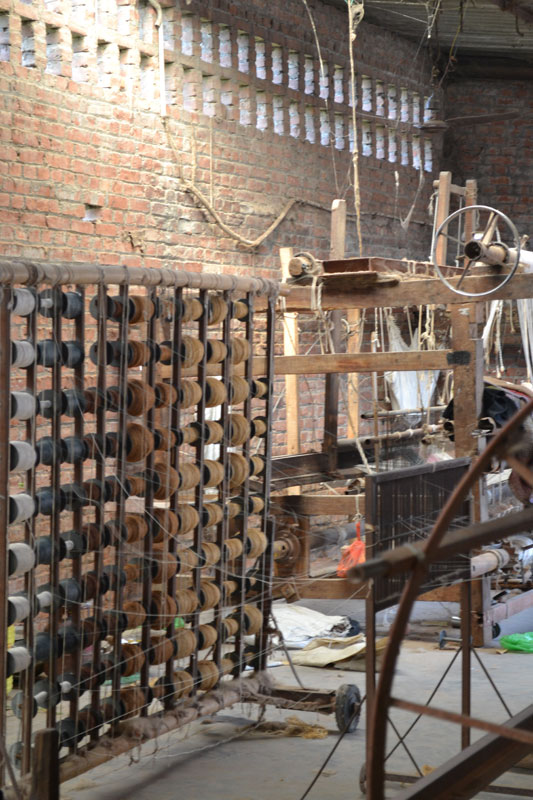 The carded wool is spun on a Charkha or the spinning wheel to produce the yarn. The thickness of the yarn depends on the quality of the carpet and usually a 3 ply yarn is used.