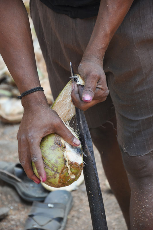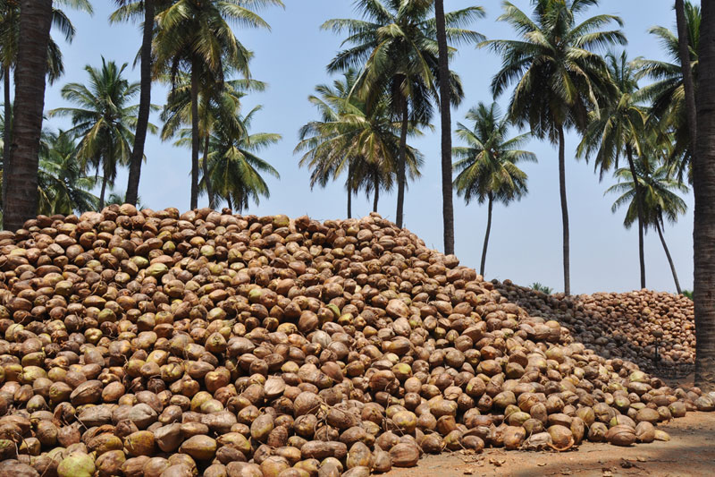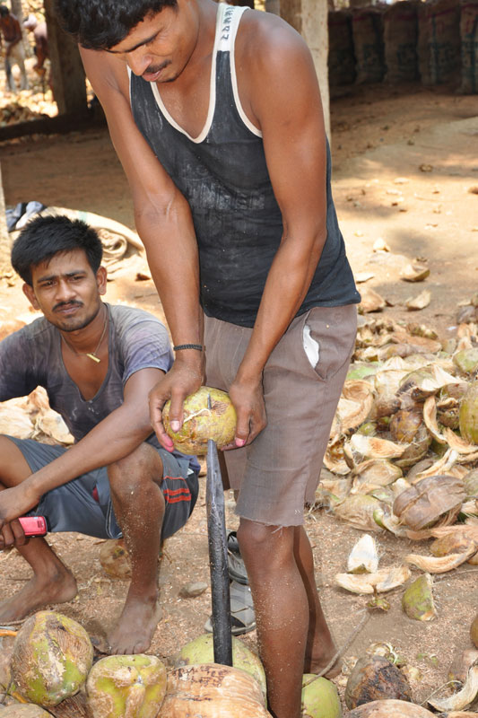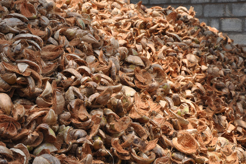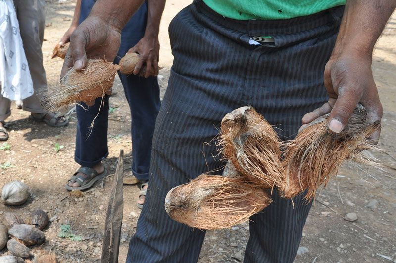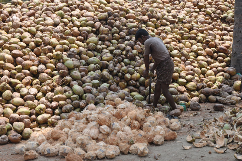 Raw coconuts are collected from the coconut farms after harvesting. These are dried in open fields for two to three days under proper sunlight. The husk is the outer layer of the coconut which is very hard. Hence, only experienced workers are allowed to remove the husk using sharp-edged iron rods which are fixed to the ground. The coir is segregated as per the color and the quality and also depending on the product to be made. White coir is extracted from green husk and used for making ropes and other house hold products. Wherein, brown coir extracted from fully ripe brown husk and is used for making thick ropes and mats.