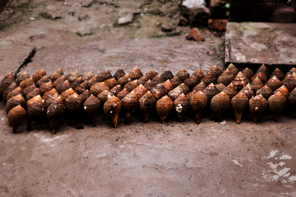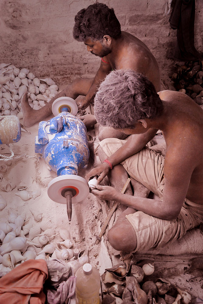 Due to its immense availability, creativity stroke it in the form of crafting, a designing method practiced in India for ages. They are thus used in the making of artistic utility items like decorative products, jewelry, religious instruments and are also suitable for load-bearing ceramics, building construction, aerospace engineering, and computer industry applications. The powdered form of these shells is used as color as well as an ingredient in certain medicines. Due to the queen shell’s property of strength and thickness that is almost 1000 times than other varieties, wide application of the material is seen in the construction field. On the religious front, the jewelry collection from the type includes varieties of necklaces, clips, bracelets, bangles, etc. Lokenath Sankha Shilpagar is a place where conch shell bangles are made. Artisans from this factory carve intricate designs on bangles to keep this traditional art alive.