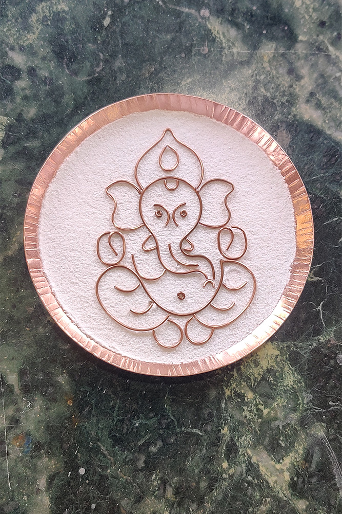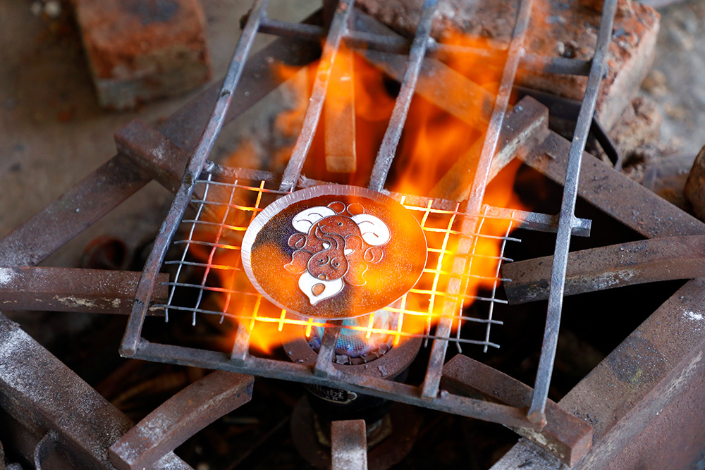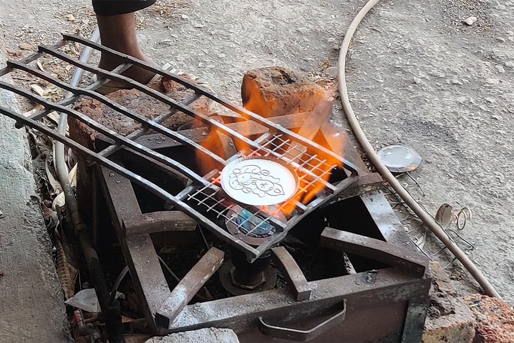 The copper enamelling process starts with the cutting of copper sheets. The required design is printed and pasted on the copper sheet. A flat copper sheet is cut using a copper cutting machine. Then it is given a proper curve or shape by beating with a hammer. In this process, a round-shaped sheet is used. Then a clear flux powder is put into the copper sheet. This powder works as a base coat. A thin copper wire is used to make design patterns. The wire is bent and cut using scissors. The cut pieces of copper wires are put together on the flux-applied copper surface as per the design. The sides are cleaned using a brush. Now this plate is put on a gas stove for heating. The process of heating helps flux powder to melt and fix the copper wire pieces on the surface. Here the melted flux powder acts as a base coat. The heated plate is allowed to cool for some time. After cooling it is dipped into the sulphuric acid solution. The art piece is cleaned using a buffing machine. Now comes the colouring part.