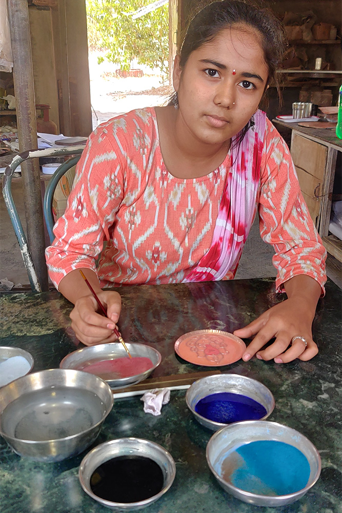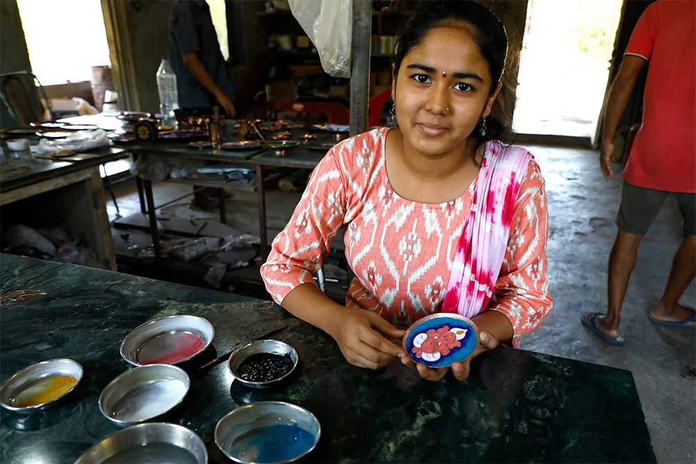 The colour glass powder is made by crushing colour glass stones using a Kandap machine. The glass powder is mixed with water to make it wet. This wet glass powder is now put on the design by using a brush. Bright and eye-catching colours are used for painting. Once the painting is done excess water on the surface is tipped using a cotton cloth. The cotton cloth soaks an excess amount of water from the design. The art piece is heated once again. Now heating will help to enhance and fix the colours. After cooling, the art piece is dipped into the sulphuric acid solution. This process removes impurities that occur from the heating process. It is buffed one more time. And here is the final product.