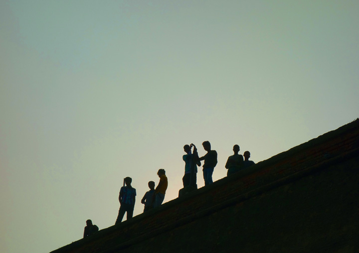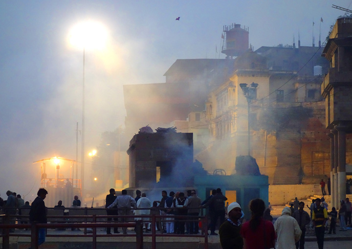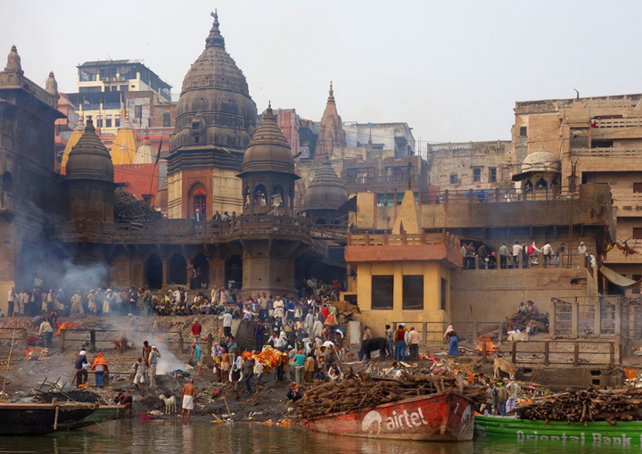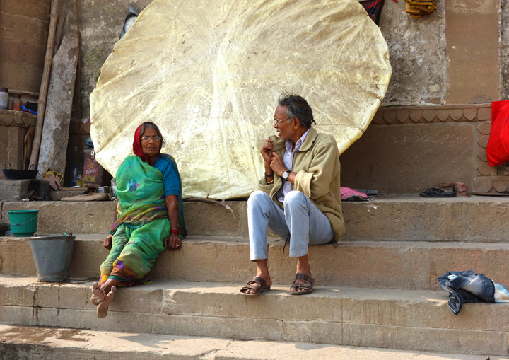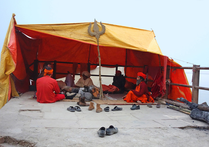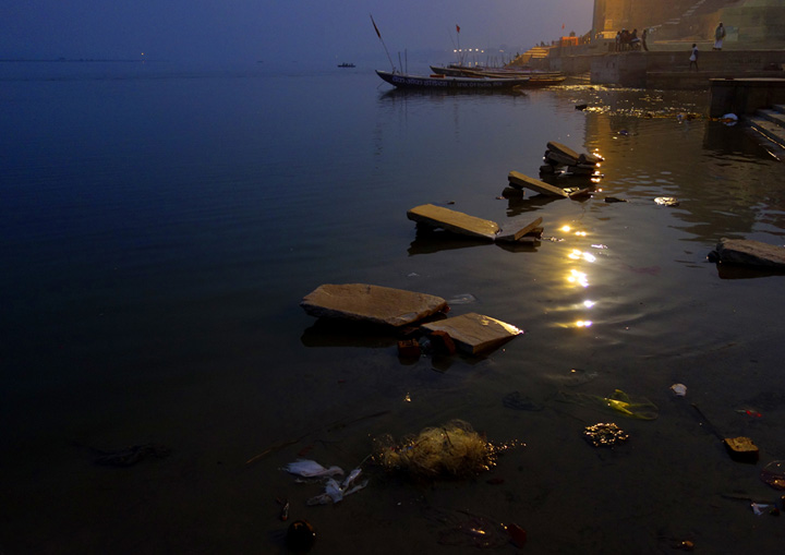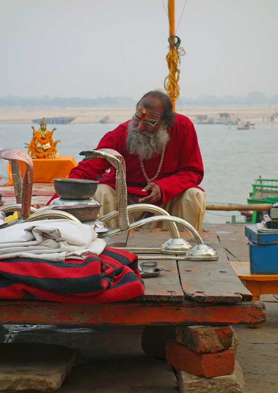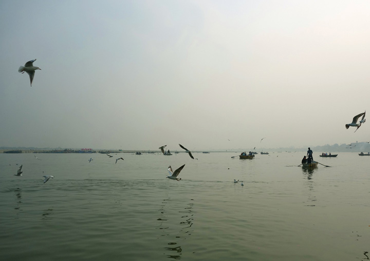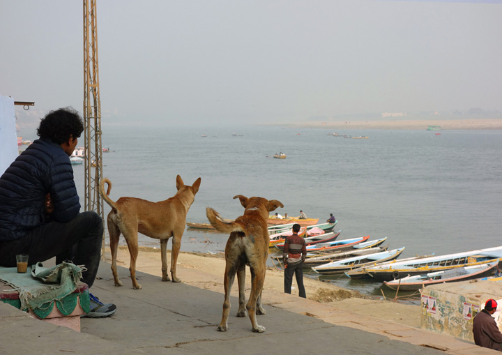 Sages, men and dogs alike sit on the same Ghats, sharing the same view. Young men have casual conversations about ideologies and utopias on the steps outside their houses. Priests prepare for the Ganga aarti in the evening, while astrologers advise worried women, locals take a nap under the characteristic cloth umbrella's, while some folks interact more easily with animals. A sadhu is stoned under the effect of charas, while the temple drummers remain euphoric while becoming one with the drum beats. Seagulls fly over the surface just enough to skim across it, creating ripples, while the dead bodies wait patiently for their turn on the Ghats used for cremation, where the fire never dies. Smoke slogs its way into the evening sky, adding to the mysterious charm that hangs in the air. Rubbish floats through the river creating disturbances in the otherwise smooth surface, while boatmen and hawkers compare their earnings for the day.