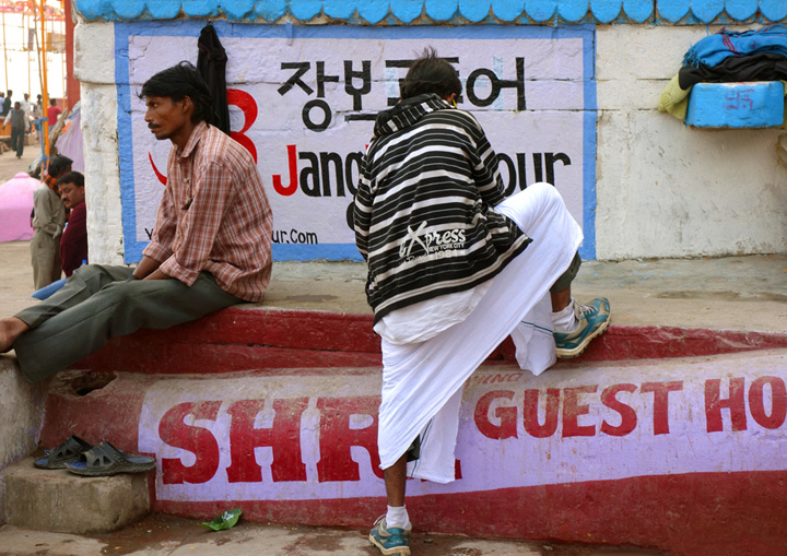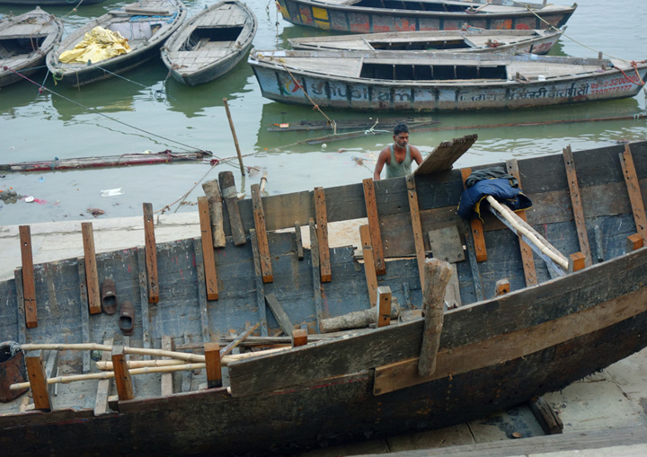 People become mere props, that are stationary in their places with nothing to do, but be hypnotized by the depths of the dull gray Ganga. In the absence of tourists the boatmen busy themselves with mundane activities of cleaning, building boats and having conversations.