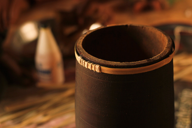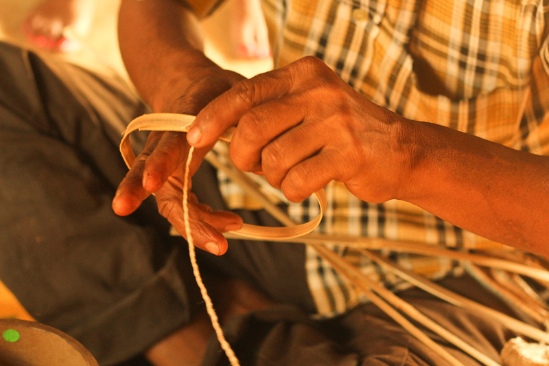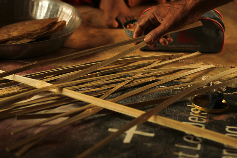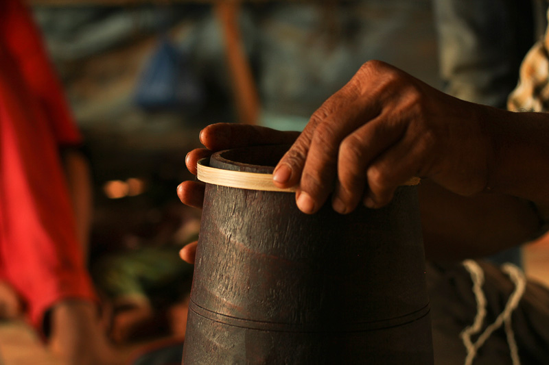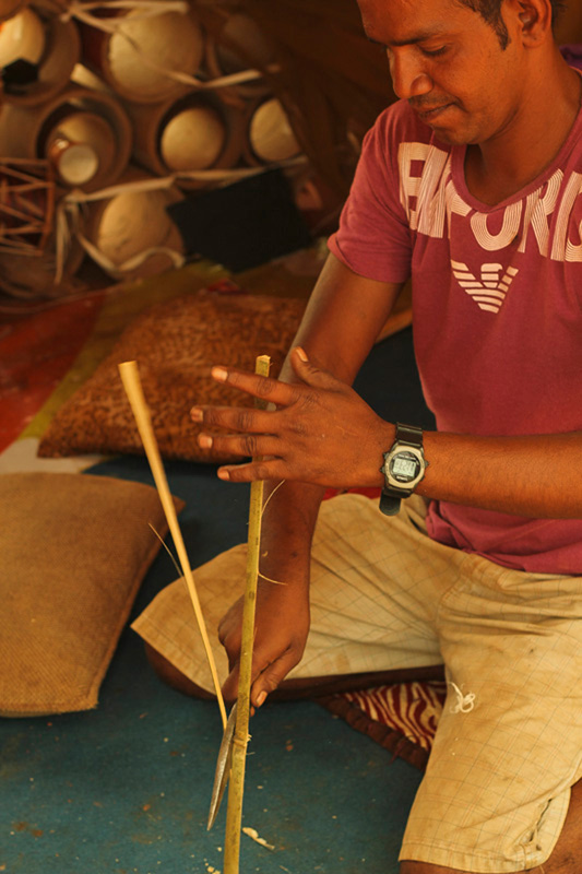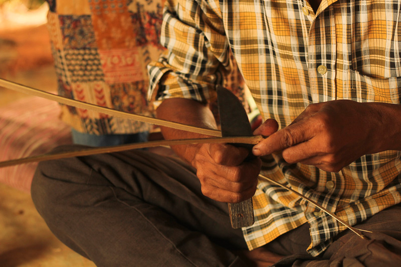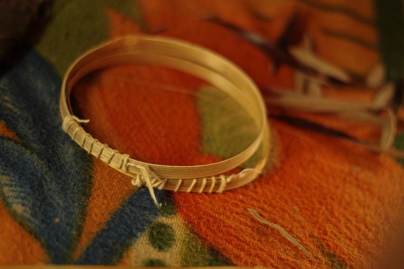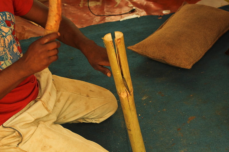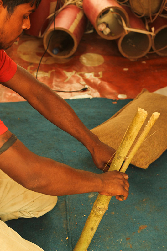 Thin strips of bamboo are extracted from hollow bamboo sticks. It is used as rings to fasten membrane. These strips are soaked into the water to increase their flexibility. Bamboo strip is rolled around the end of the dholak to form a ring. The rings are placed on the dholak body to ensure the measurements.