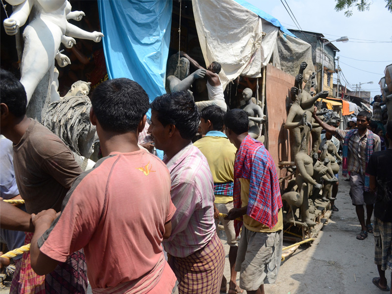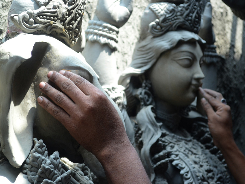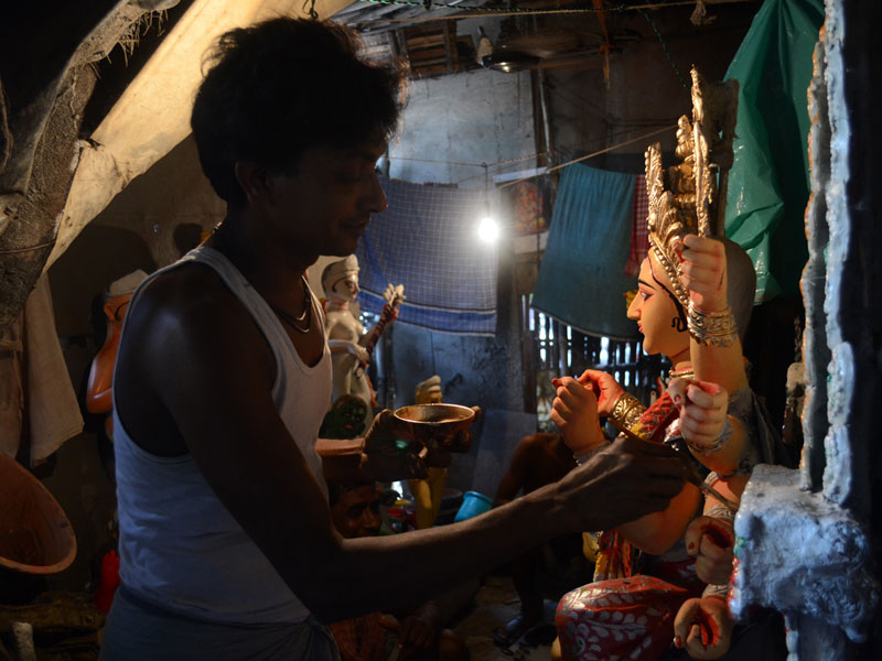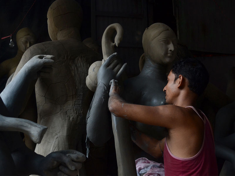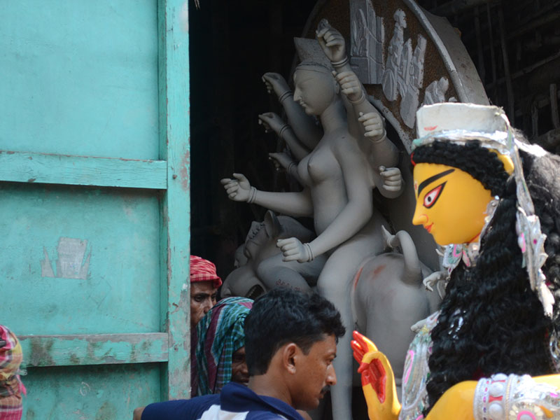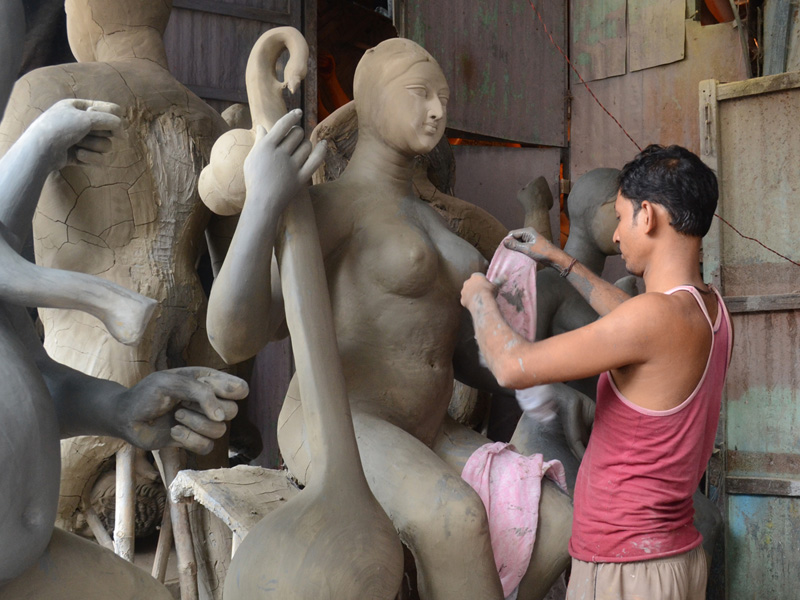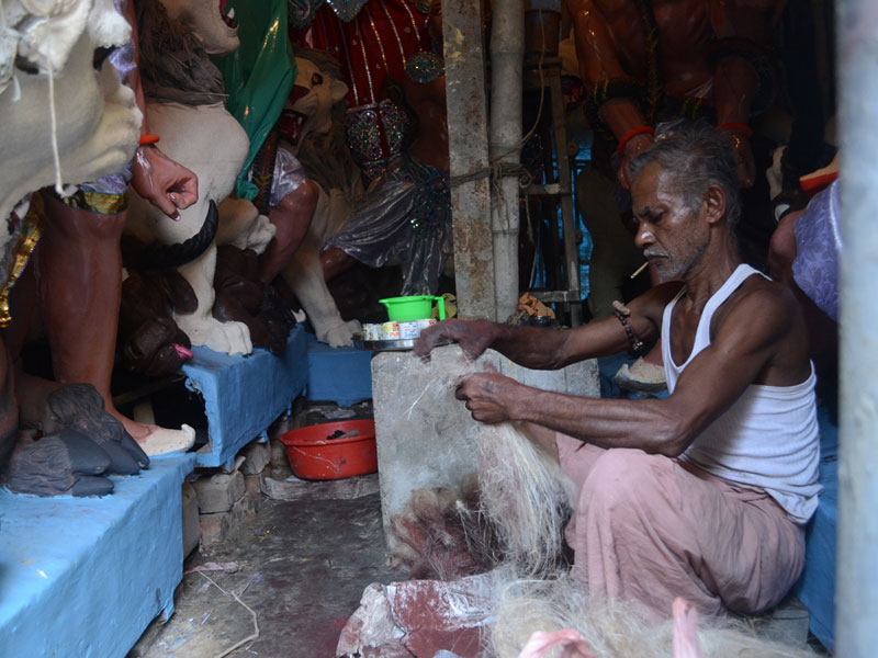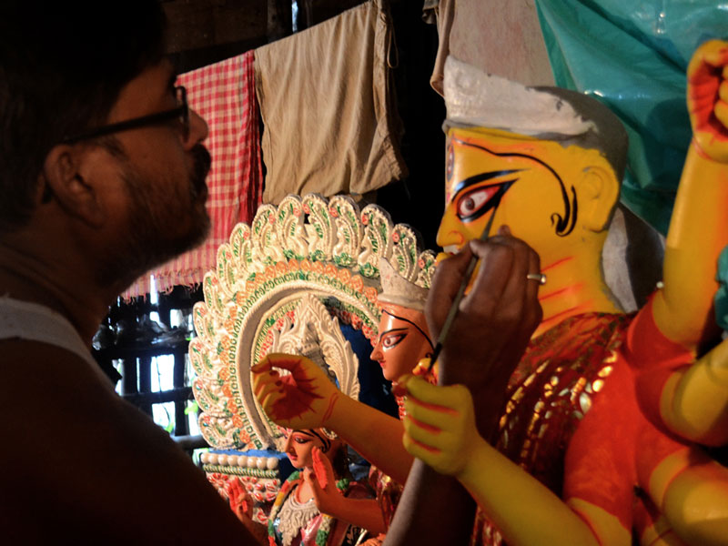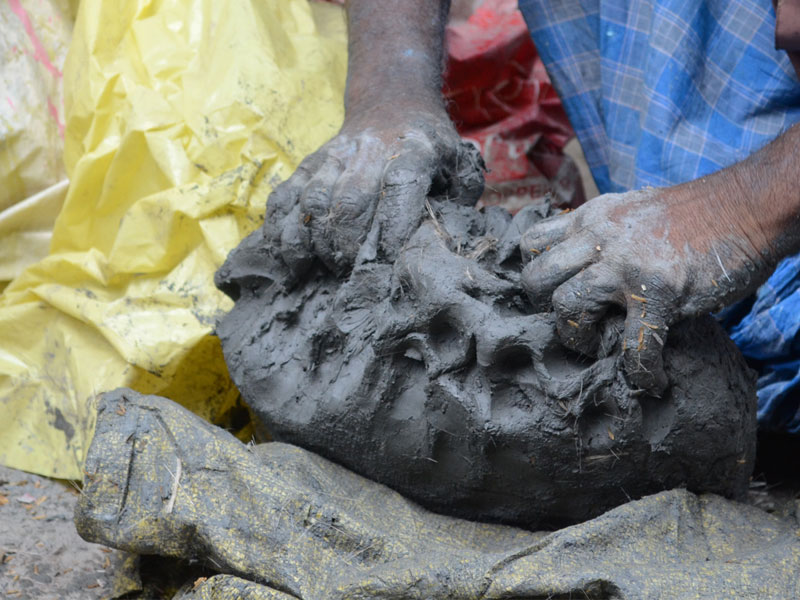 The place is called Kumortuli where the potter group works day and night to give the idol its shape. This procedure starts with the ritual called “Kahamopuja”, a prayer to the god before making the structure made of straw. Then they put black sticky clay on the structure to make the idol. After a bit of final finishing the idol is pained with colour and decorated with jewellery.