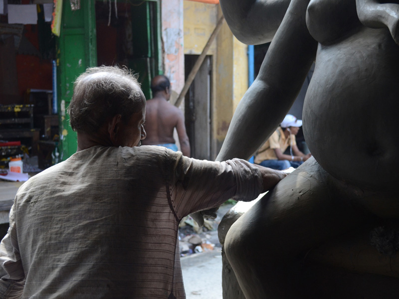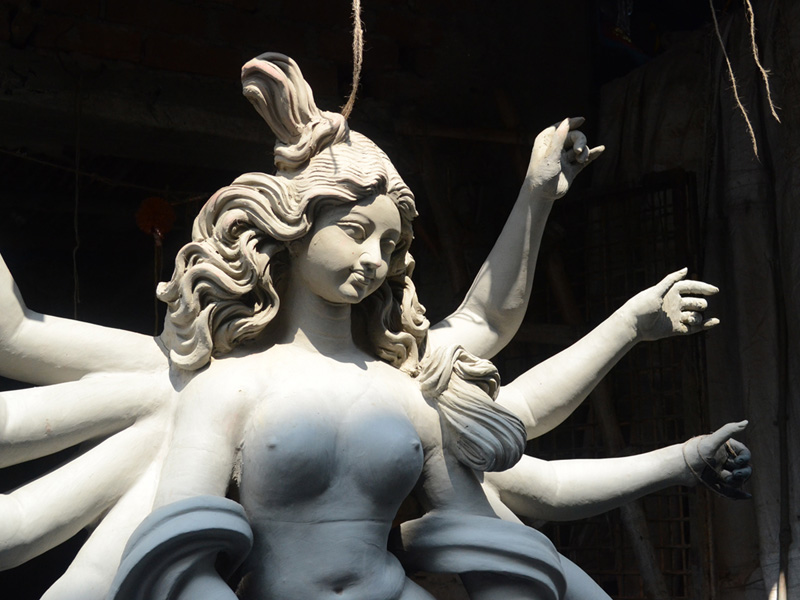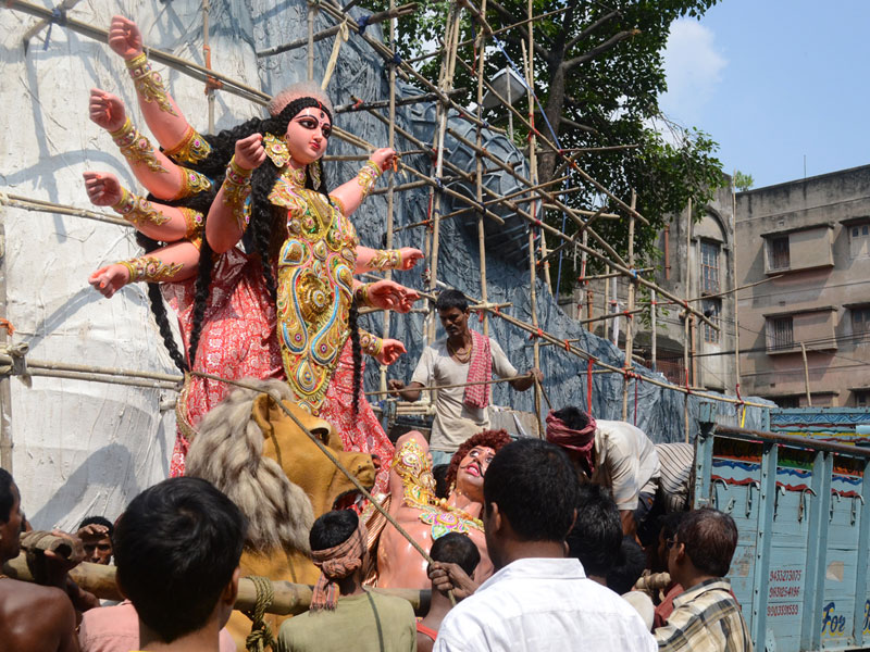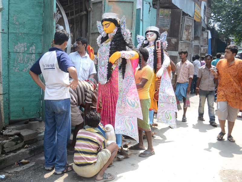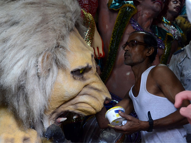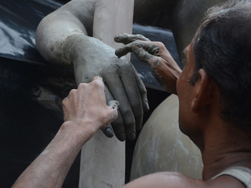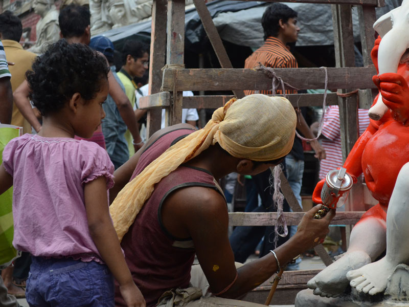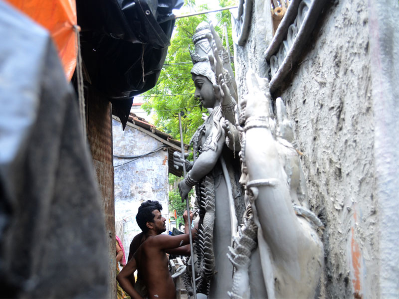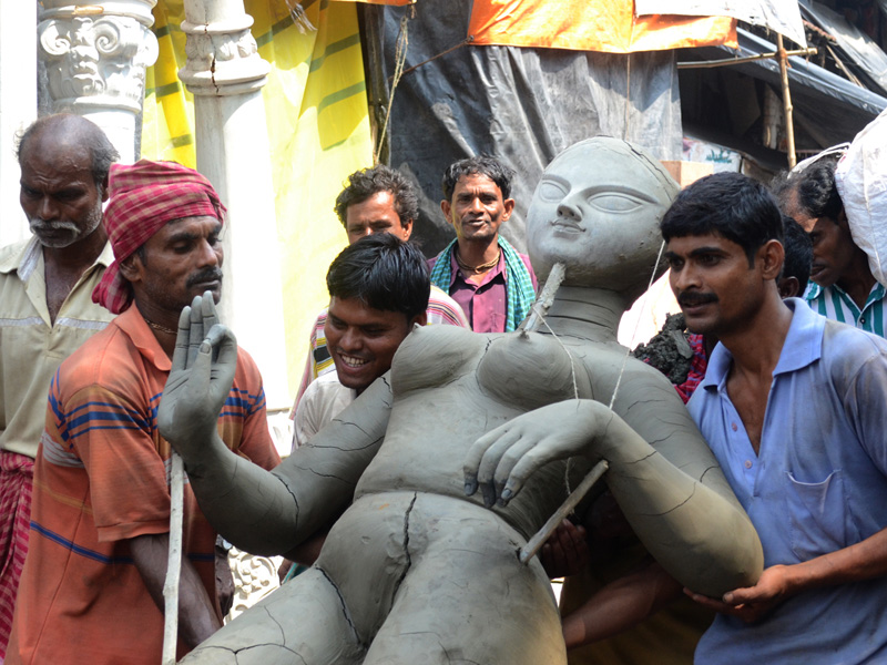 The place is called Kumortuli where the potter group works day and night to give the idol its shape. This procedure starts with the ritual called “Kahamopuja”, a prayer to the god before making the structure made of straw. Then they put black sticky clay on the structure to make the idol. After a bit of final finishing the idol is pained with colour and decorated with jewellery.