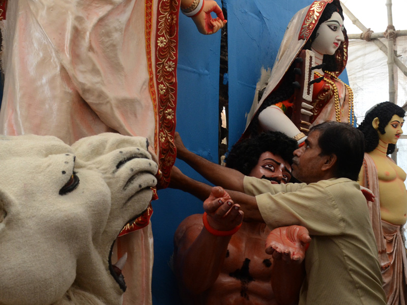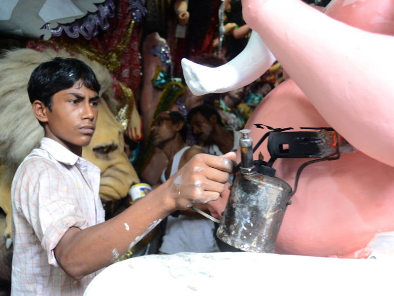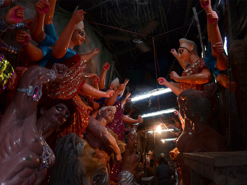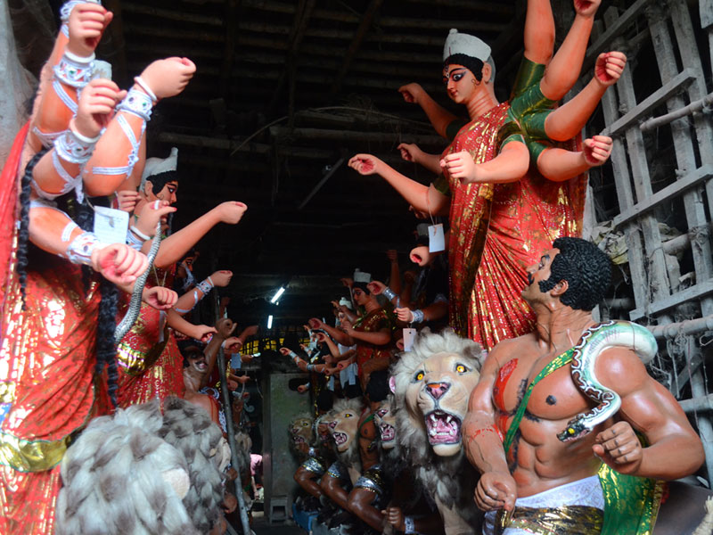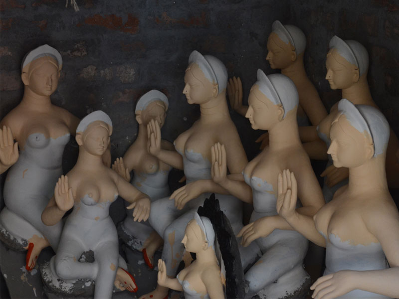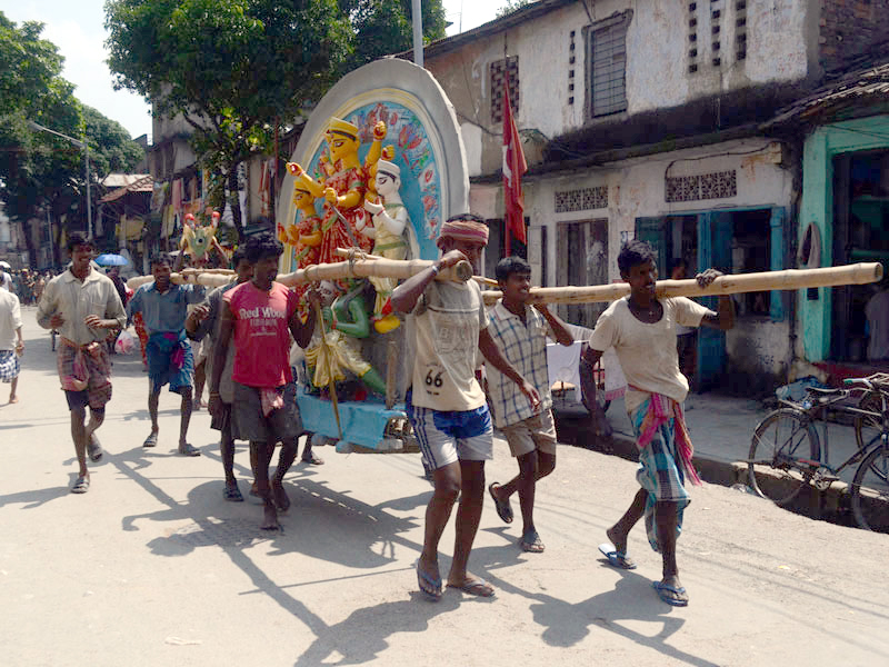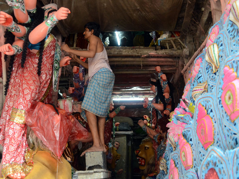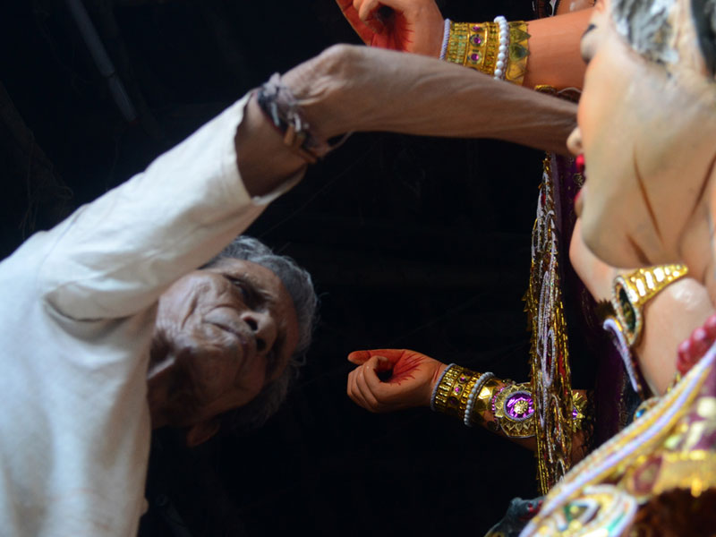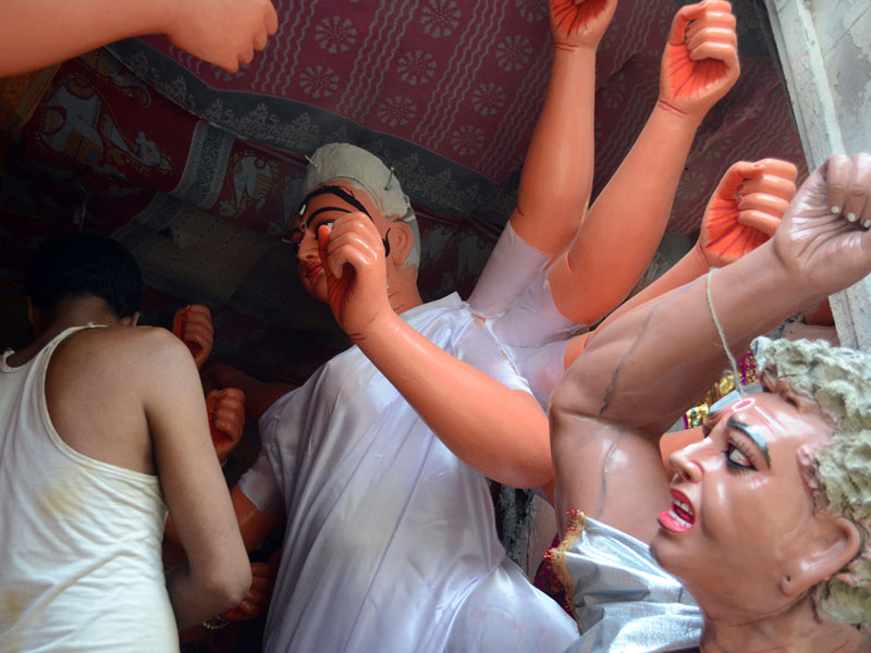 The place is called Kumortuli where the potter group works day and night to give the idol its shape. This procedure starts with the ritual called “Kahamopuja”, a prayer to the god before making the structure made of straw. Then they put black sticky clay on the structure to make the idol. After a bit of final finishing the idol is pained with colour and decorated with jewellery.