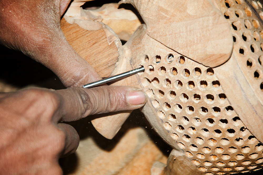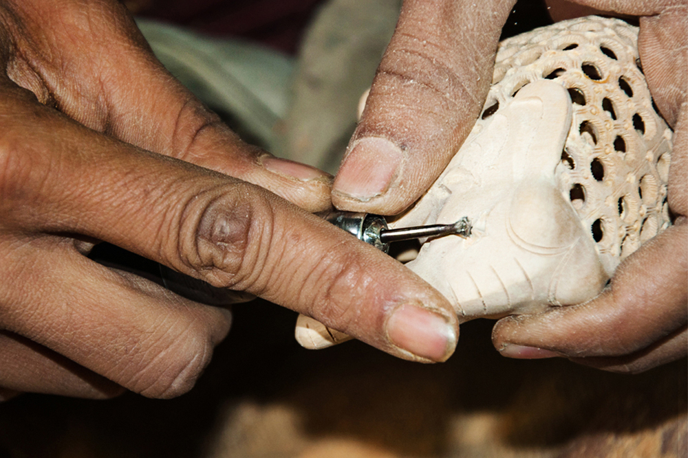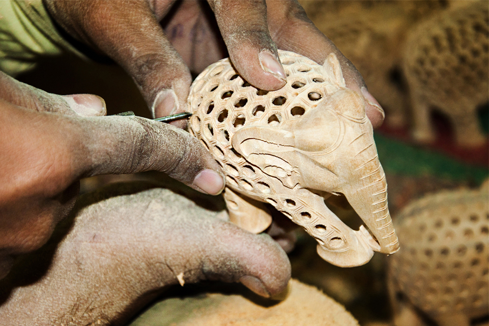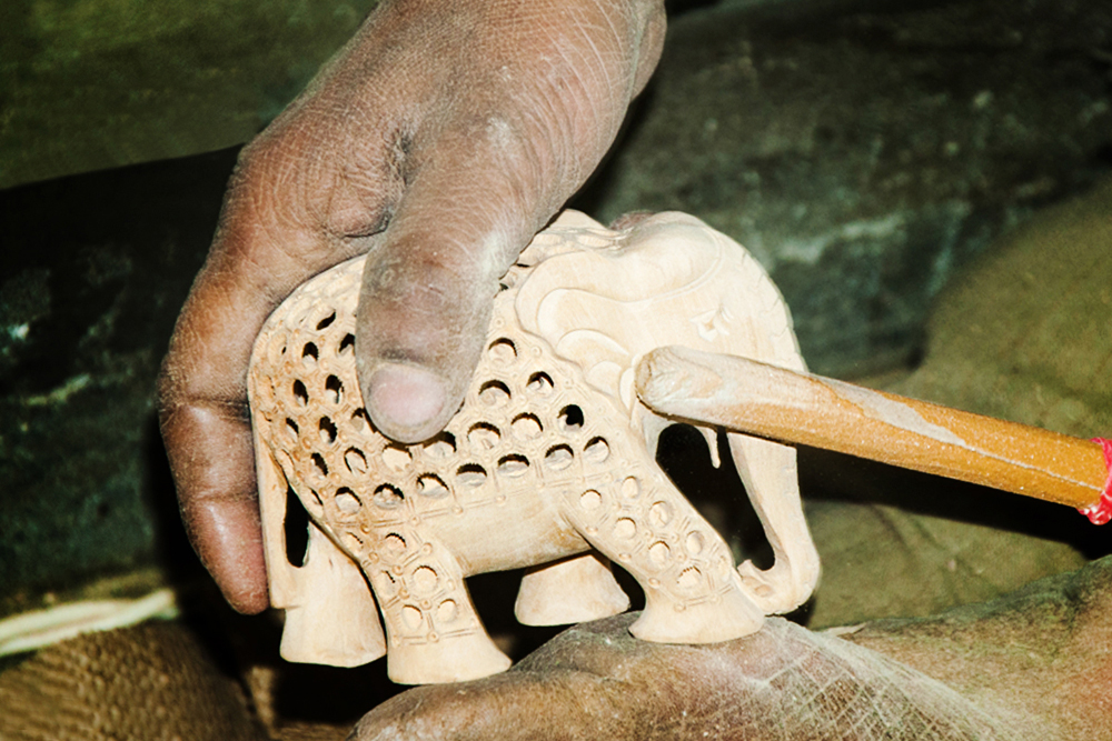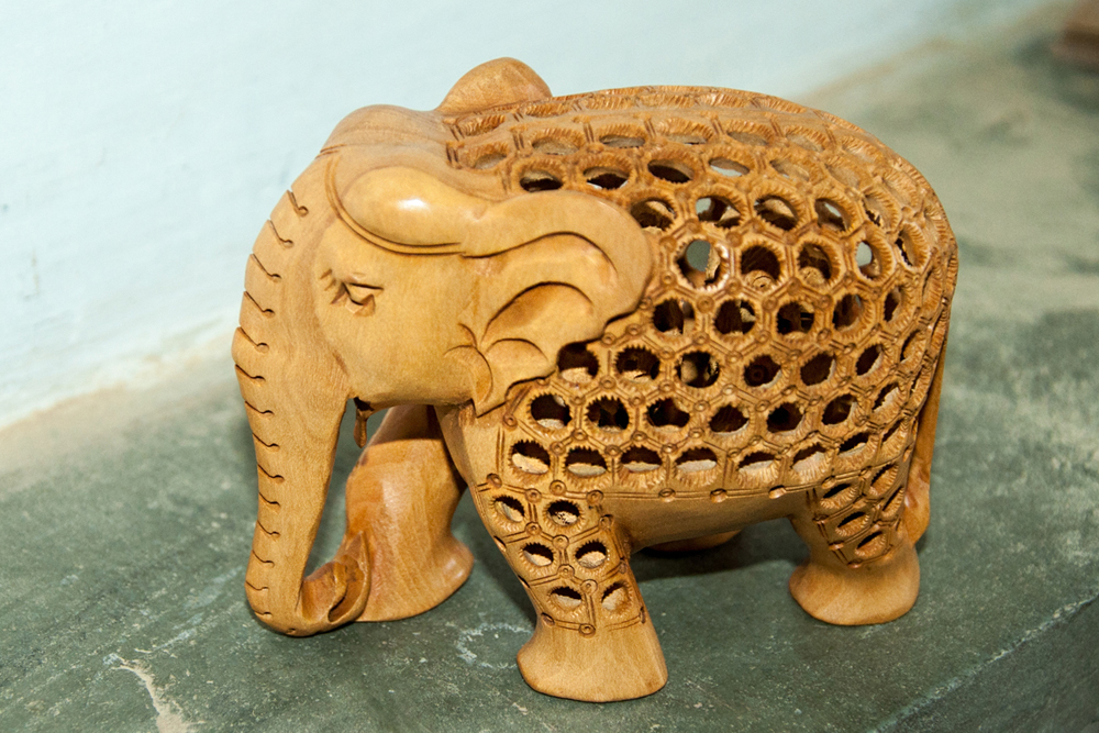 The artist buys the seasoned wood of Neolamarckia cadamba, which is also called as Kadam wood in general. This wood is used for elephant undercut work, as it is available in local markets of Jaipur. The process of making elephant jali work begins by marking the measurements on the wood by using the marking tools and then it is cut by using the saw tool and sizing it accordance to their need. The jali artist draws the design of an elephant on the wood and chisels it to get the rough shape of an elephant. Later it is made numerous holes on the elephant figure by using the power tool with different micro drill bits at every step. These drill bits are swappable from the power tool. Initially spade bit is used to mark the exact location on the figure, where the hole has to be made. Later the centre punch drill bit is used to make the holes. Through these holes, the gouge drill bit is inserted to scrap out the wood and hollowed out from within, wherever the necessity is. The specialty of this elephant jali work is, the baby elephant is crafted inside the big elephant. The outer shell of the statue is retained the same and the detailed hand carved jali work is made. Then the design of the holes and the designs between the holes are finely made, using the micro circular saw bit. In the next level the rock cross drill bit is used for detailing the shape of the eyes and ears of the elephant. After shaping the detailed designs on the elephant jali, emery sheet (that is rolled and attached to the power tool) is rubbed all around the elephant idol. By this process the semi finishing is done.