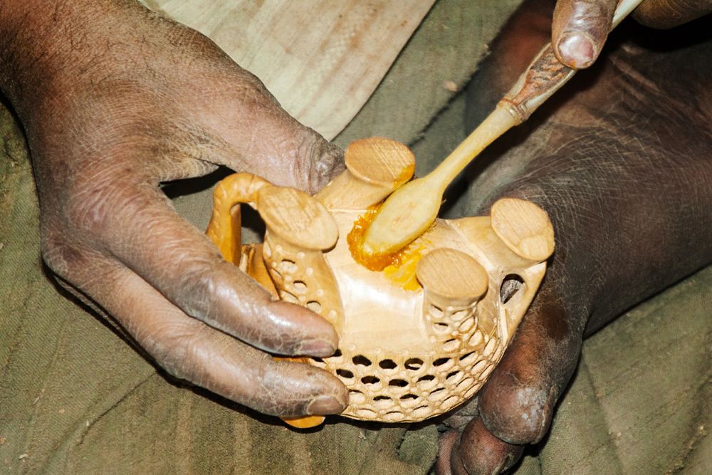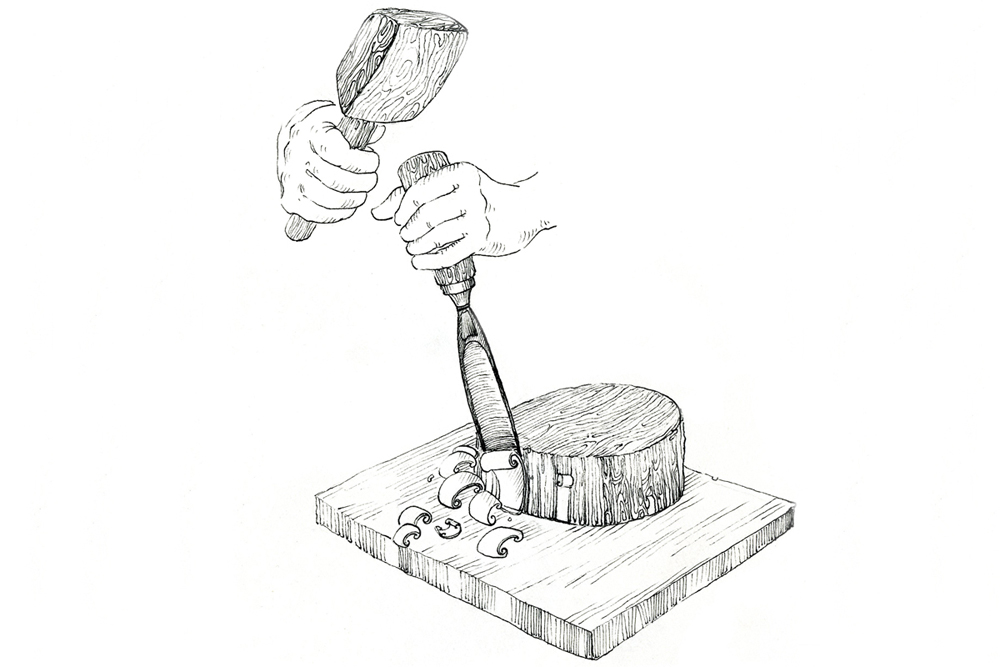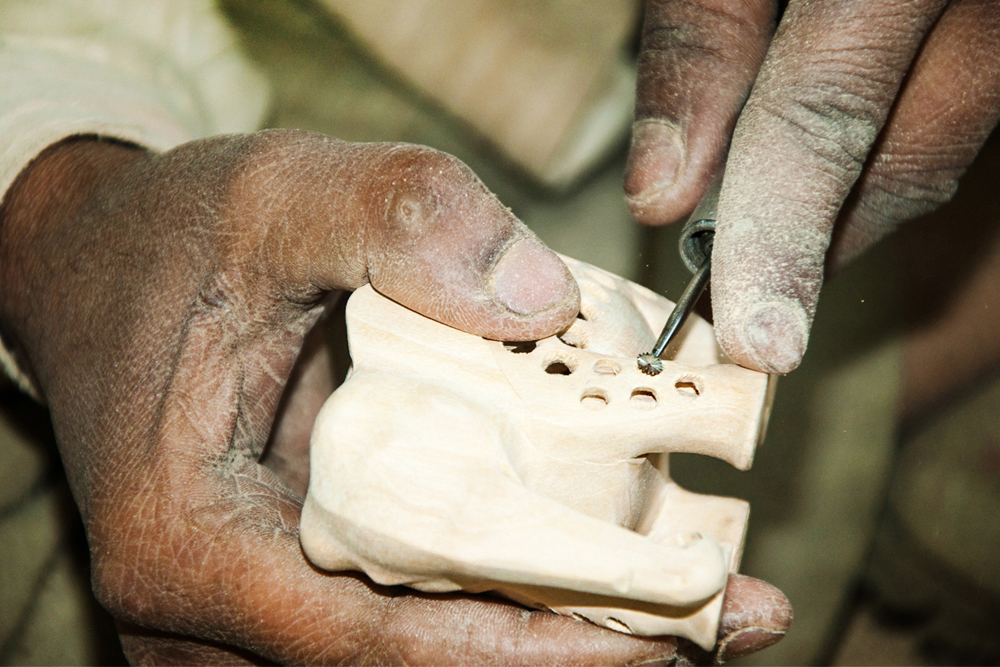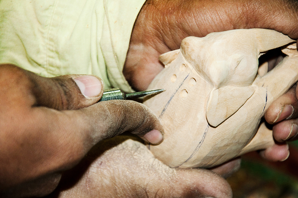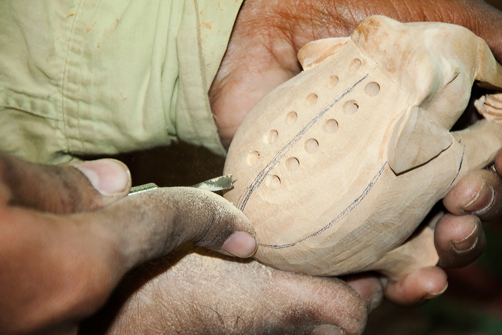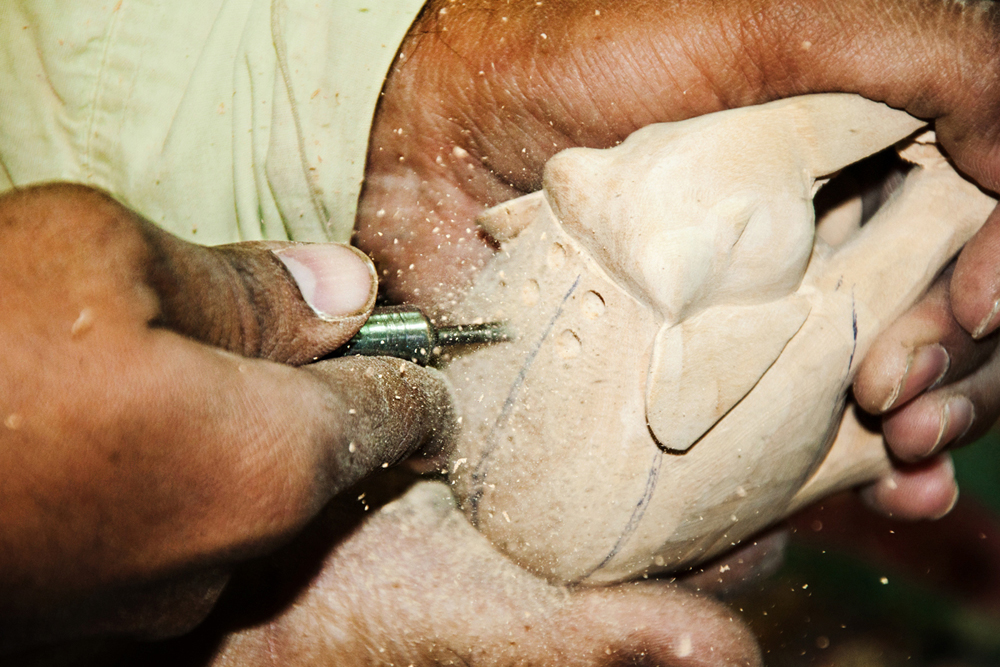 The artist buys the seasoned wood of Neolamarckia cadamba, which is also called as Kadam wood in general. This wood is used for elephant undercut work, as it is available in local markets of Jaipur. The process of making elephant jali work begins by marking the measurements on the wood by using the marking tools and then it is cut by using the saw tool and sizing it accordance to their need. The jali artist draws the design of an elephant on the wood and chisels it to get the rough shape of an elephant. Later it is made numerous holes on the elephant figure by using the power tool with different micro drill bits at every step. These drill bits are swappable from the power tool. Initially spade bit is used to mark the exact location on the figure, where the hole has to be made. Later the centre punch drill bit is used to make the holes. Through these holes, the gouge drill bit is inserted to scrap out the wood and hollowed out from within, wherever the necessity is. The specialty of this elephant jali work is, the baby elephant is crafted inside the big elephant. The outer shell of the statue is retained the same and the detailed hand carved jali work is made. Then the design of the holes and the designs between the holes are finely made, using the micro circular saw bit. In the next level the rock cross drill bit is used for detailing the shape of the eyes and ears of the elephant. After shaping the detailed designs on the elephant jali, emery sheet (that is rolled and attached to the power tool) is rubbed all around the elephant idol. By this process the semi finishing is done.