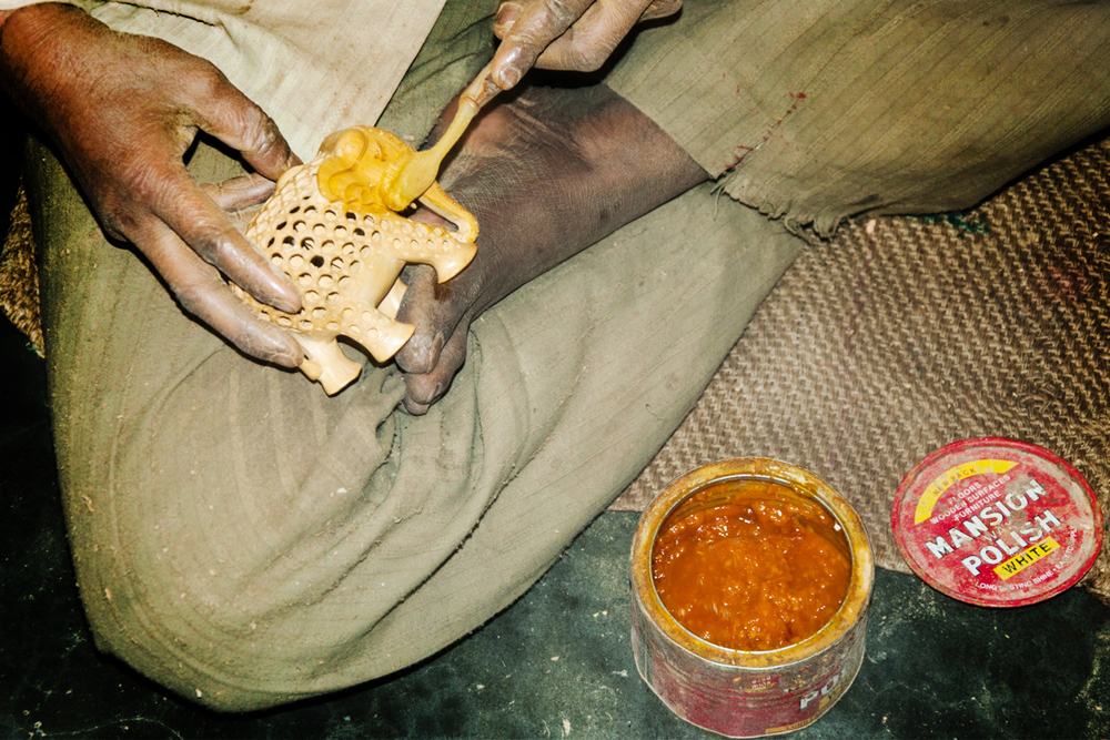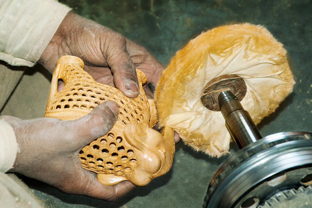 In the next level the rectangular solid form of wax and clay mixture (batti) is rubbed to the buffing head of the buffing machine. And then the powdered color is dusted onto the elephant jali idol and the idol is buffed well all around through the help of buffing head. Later the polish is manually applied by the toothbrush on the elephant jali idol evenly and buffed again. So that the fine polishing is made/given for the idol and the elephant jali work is completed.