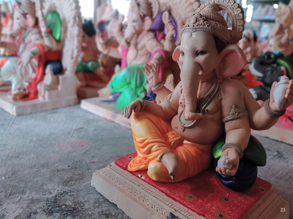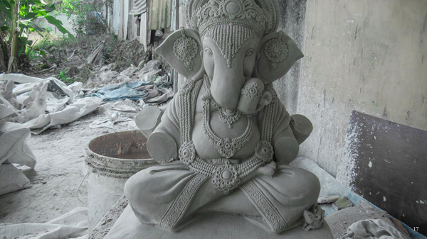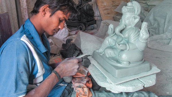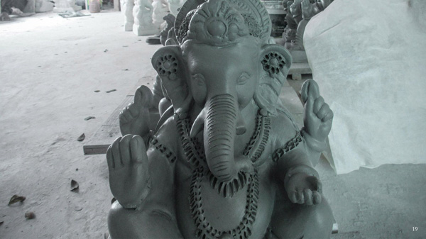 When the clay was used for idol making, it was environmentally less harmful than PoP. It is a white powder used for casting idols. A proper mixture of PoP is prepared and poured in mould to shape the idol, and natural fiber (Katha) is used for adding strength to the substance. The body of the mould is rubber which is kept inside the original mould. Once set, the idol is removed from mould, and is painted with white primer to paint.