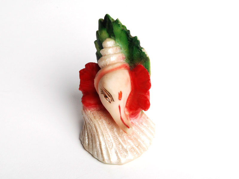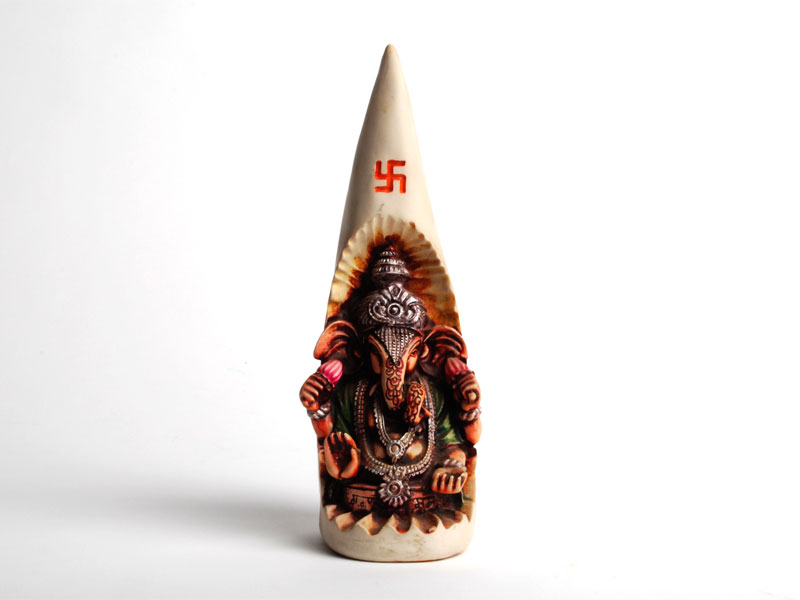 5. A moulded Ganesha in plastic is approximately 170mm in height. The main element here is a tusk inside which is seated a colourful, exquisitely detailed Ganesha. A swastika emblem also adorns the tusk. Both the tusk and the Swastika are symbolic of Ganesha, which indicates the creative interpretation of Ganesha in a decorative product.