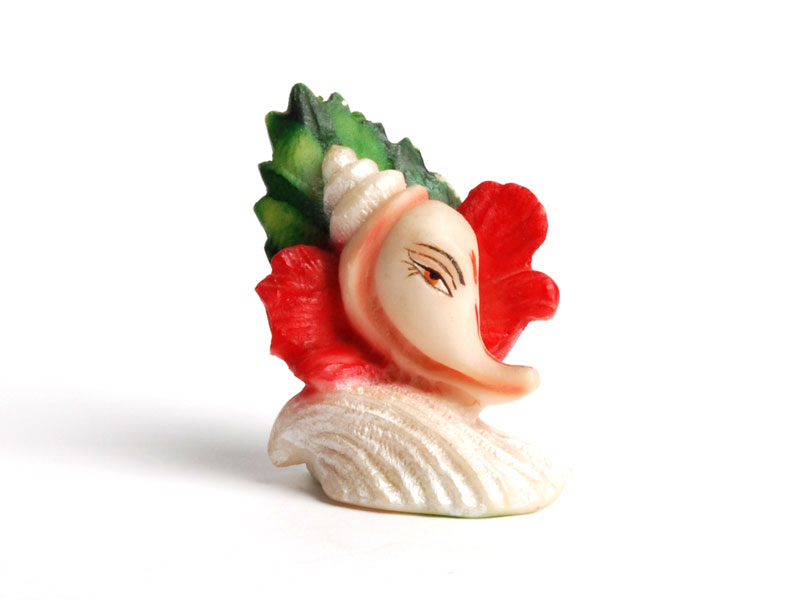 6. A plastic moulded artistic creation of Ganesha, approximately 60mm in height. The conch shell has been used to depict the Ganesha face, which is placed on the red petals of the hibiscus flower along with a green leaf - a favourite of God. A larger shell acts as a support. This again is an imaginative interpretation of Ganesha.