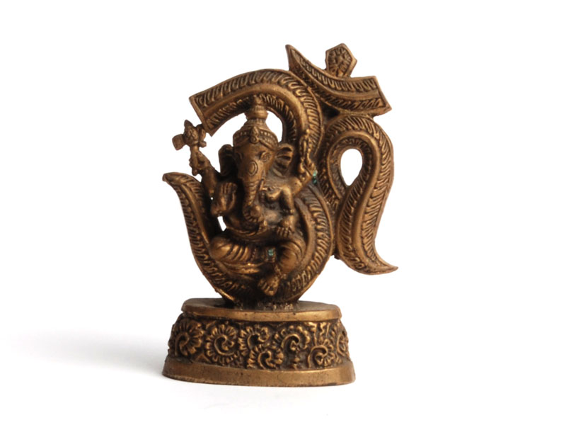 7. A brass decorative piece approximately 60mm in height. Ganesha is seated in a beautifully detailed “Aum” the sacred primary sound. The base on which both are seated is also exquisitely carved. A unique representation of Ganesha.