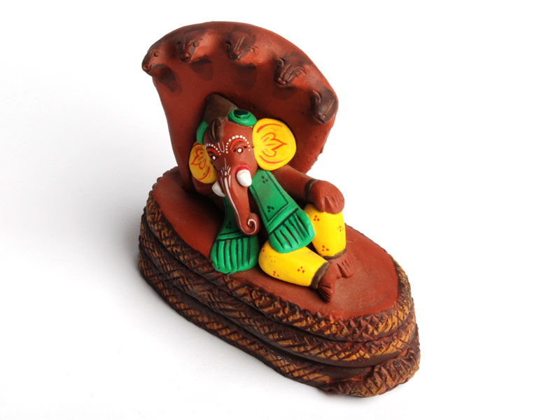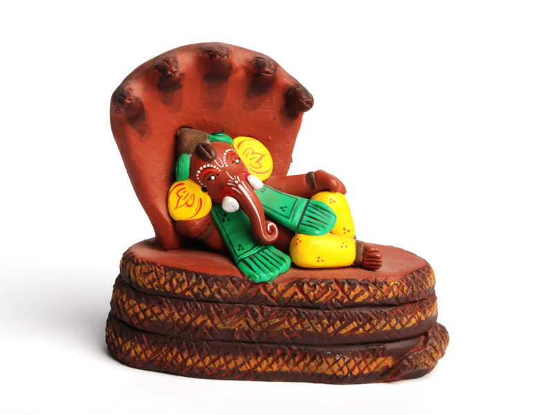 1. A Ganesha idol hand moulded in clay. He is reclining on the serpent Seshasai like Lord Vishnu. (Approximately 80mm in height) The colours used to paint the idol are bright and the detailing of the serpent and Ganesha are apt. Though the concept used is ancient, the execution is modern.
