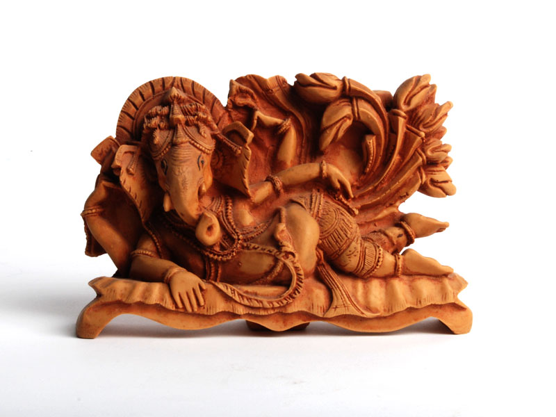 2. A Ganesha in a reclining posture in moulded plastic (approximately 100mm in height) the colour of the idol is reminiscent of a carving on a coloured stone. The features and detailing are traditional and in the background are a large bunch of lotuses blending well into the idol. This idol is also an example of a traditional concept interpreted in a modern material, yet retaining the traditional look and feel.
