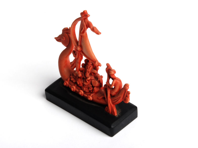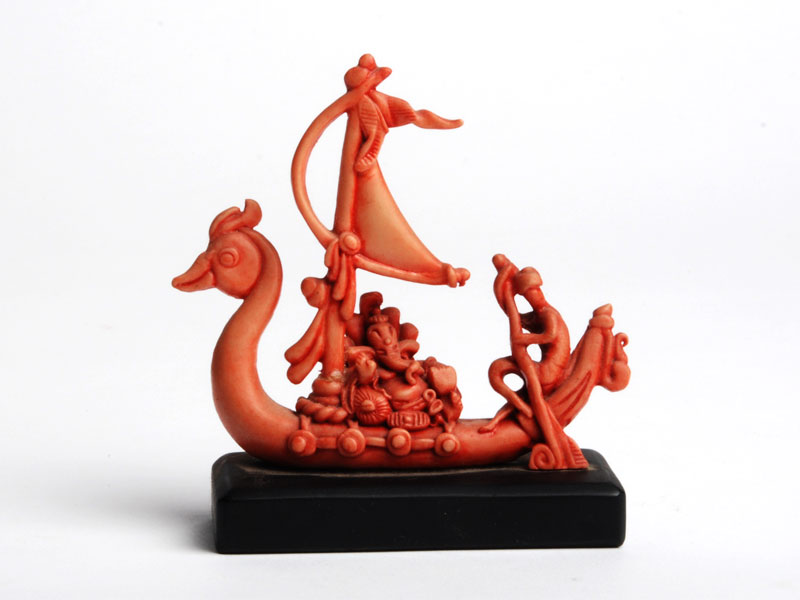 3. A decorative piece in moulded plastic depicting a boat with a swan neck in the river. It has a Ganesha idol seated in it under a canopy. The boat is mounted on a black wooden block. (Approximately 120mm in height) The colour is reminiscent of terracotta. This is an example of a modern artistic interpretation of God in terms of material and the liberty of expressing him in imaginative ways.