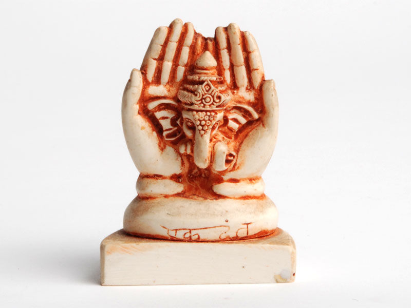 4. A decorative piece with a Ganesha head wearing a crown placed on two palms, held in reverence. This is also an example of a modern artistic interpretation of Ganesha. The piece is made of moulded plastic and is meant for the purpose of gifting. (Approximately 90mm in height).