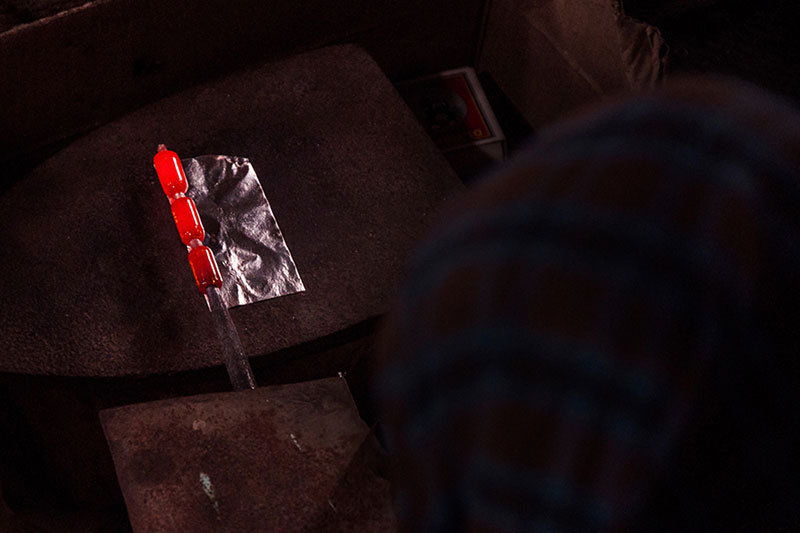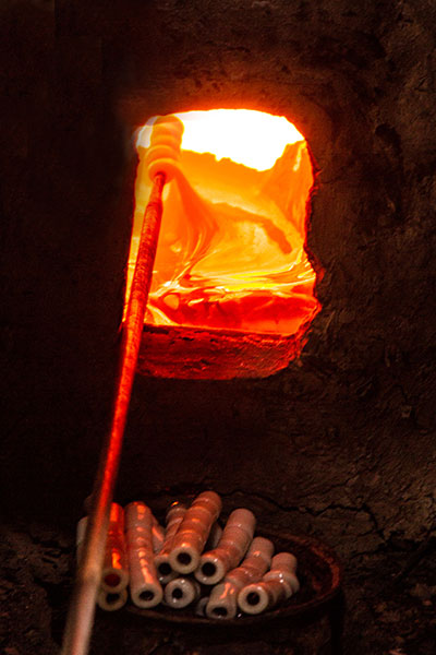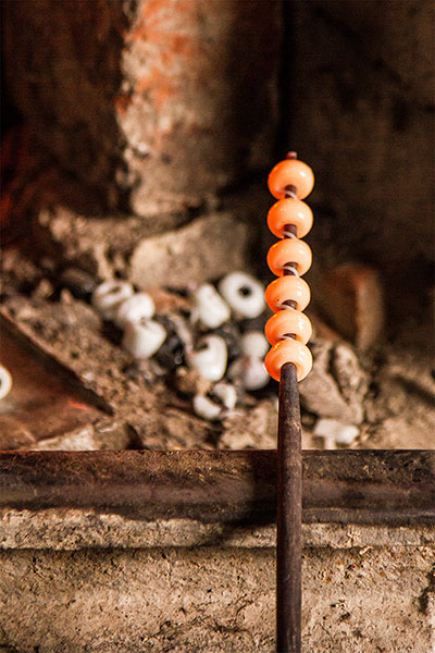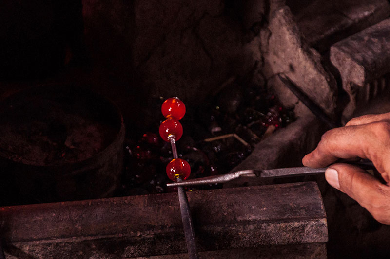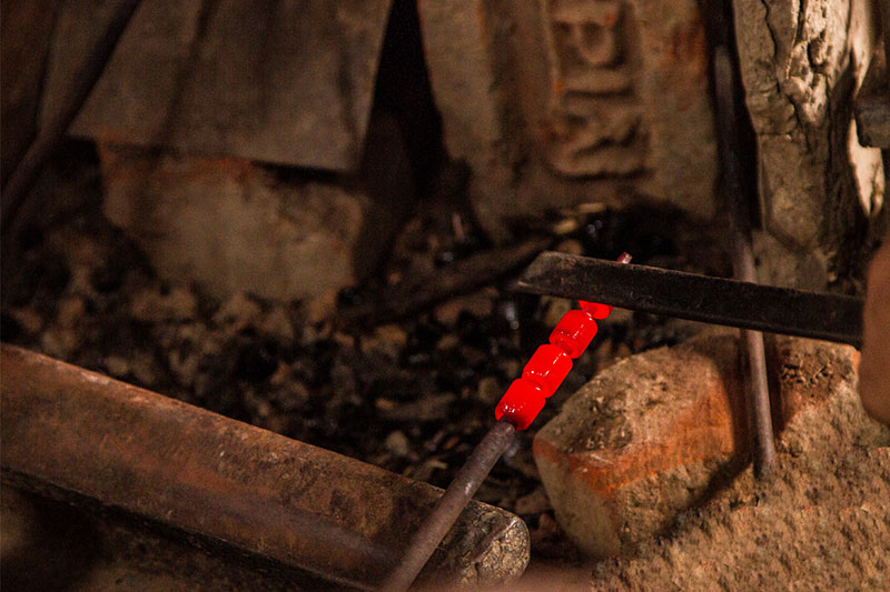 Glass beads are also produced on a major scale using the Open furnace method. The basic process of melting and molding is same for the both the bead making technique. During this method large blocks of glass are placed in the furnace which are melted, to be looped around an iron rod or Sariya, with the help of different tools like Trowel, file are used to mold the molten glass into different shapes like cylindrical, circular and flat shaped beads.