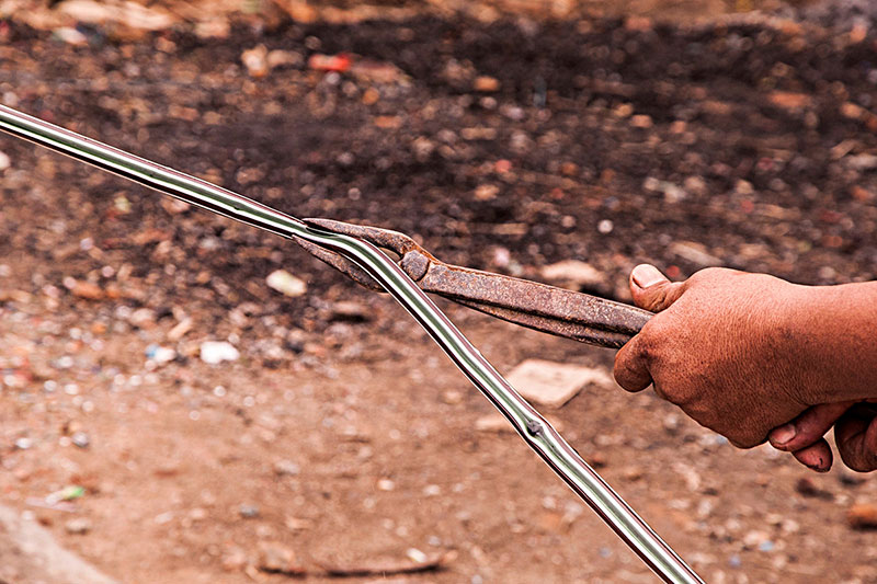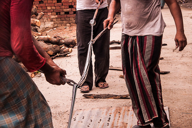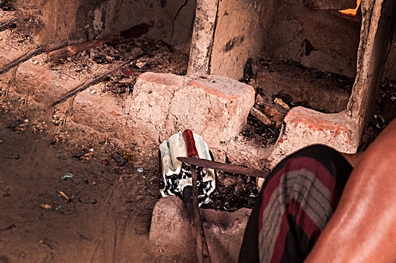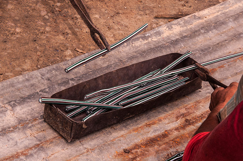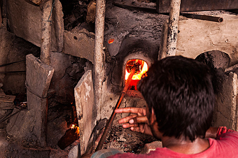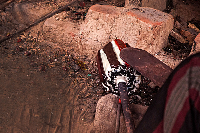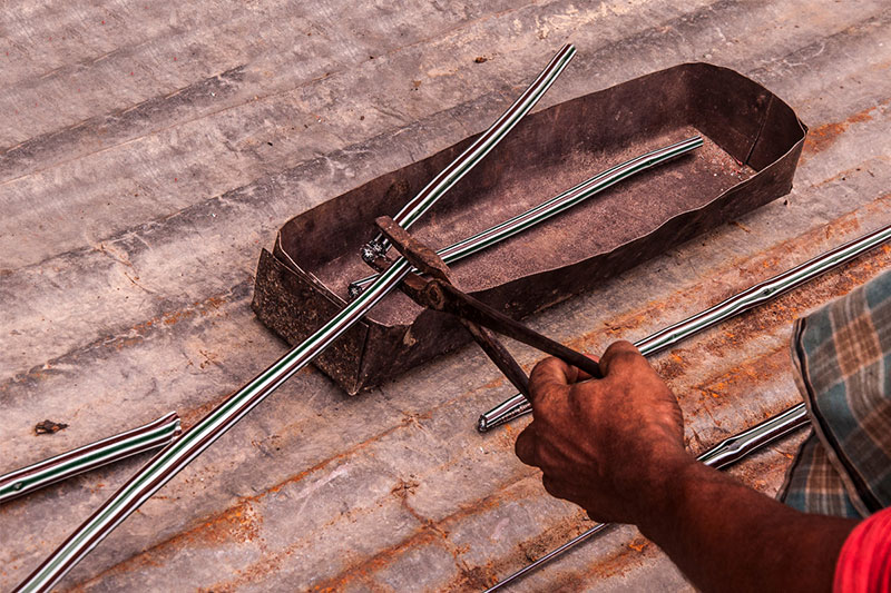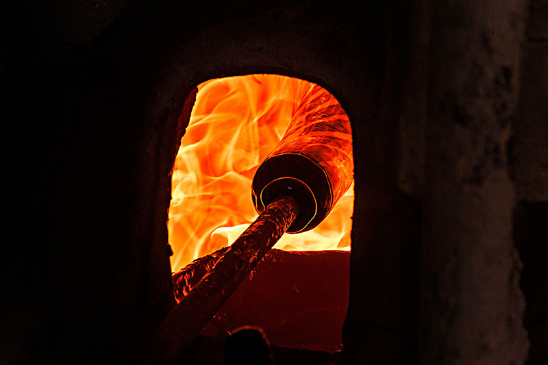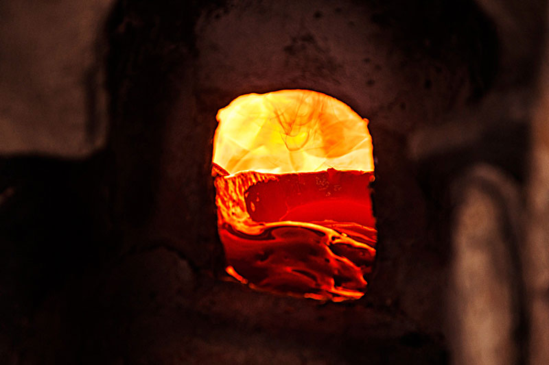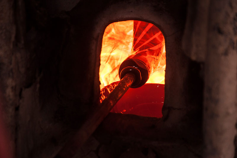 Making of Millefiori bead is a multi-step process which involves the production of glass canes or rods with multicolor pattern called murrine. These multi layered rods contain layers of semi liquid glass paste which is applied one on top of another, which is looped on to a cylindrical rod. These layers are molded in the shape of star or flower having different colors at each level. Once these rods are molded, they are then transferred to the furnace for further heating. The artisan then heats up this glass mixture or mold, while it is still in a molten state to bond the murine surface inside the furnace. After heating, these murine rods are subjected to constant pressure using a special kind of trowel to create a continuous Millefiori surface with no gas. In the final stage these pre heated murine rods are pulled to make a thin rod, without tampering the cross sectional design. Then these thin rods are cooled and further cut or broken down to form cylindrical beads.