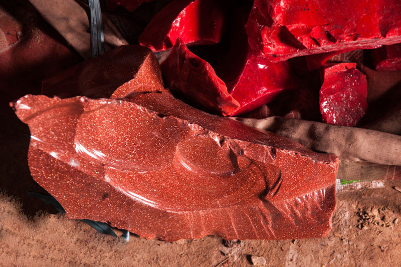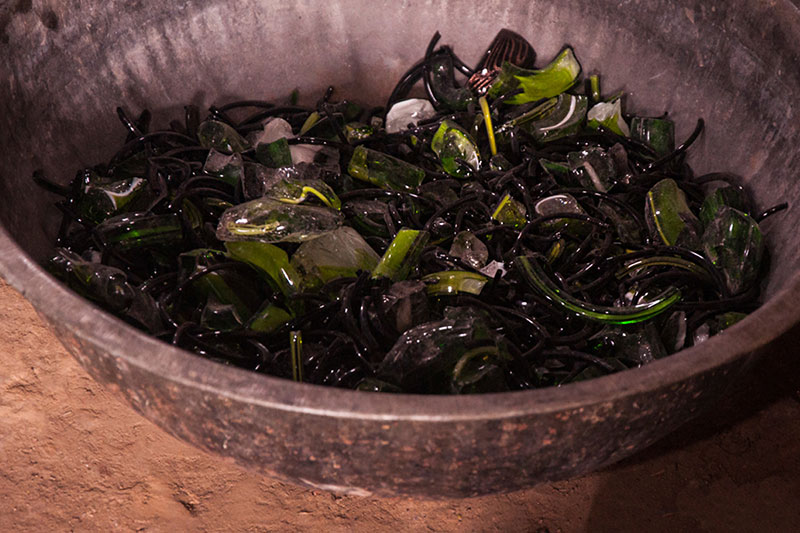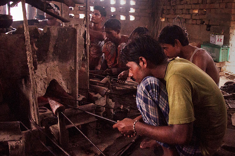 Glass rods which act as the basic raw material for all kinds of glass work are transported from Firozabad. They come in different colors and sizes and some unique ones are also imported for producing special kind of beads. Beside glass rods, large chunks of glass are also used for making bangles (kada).